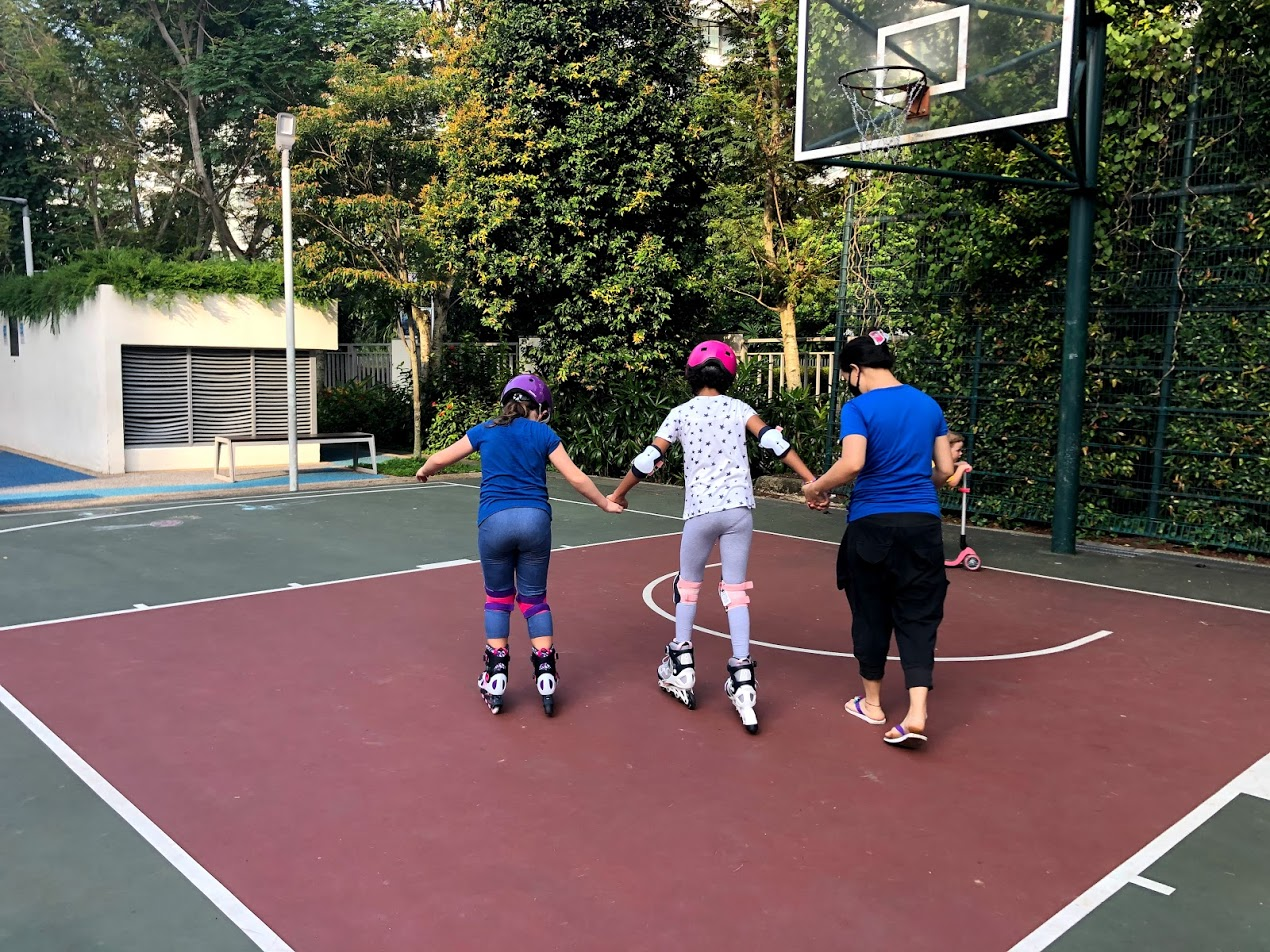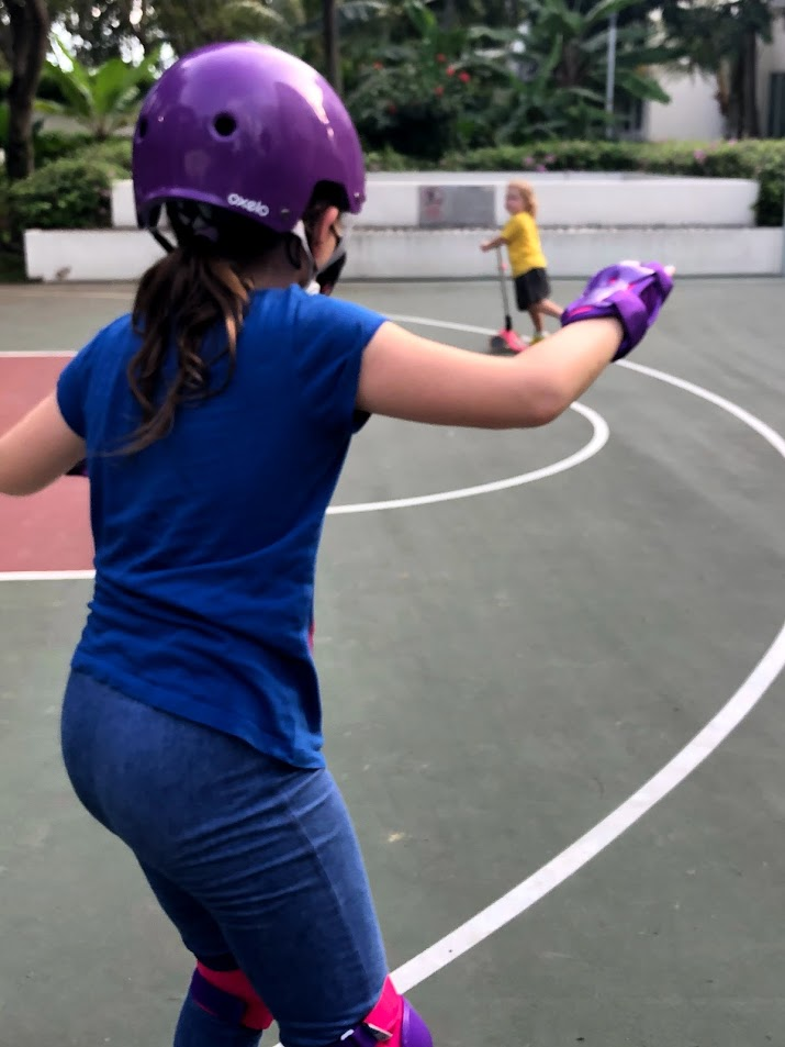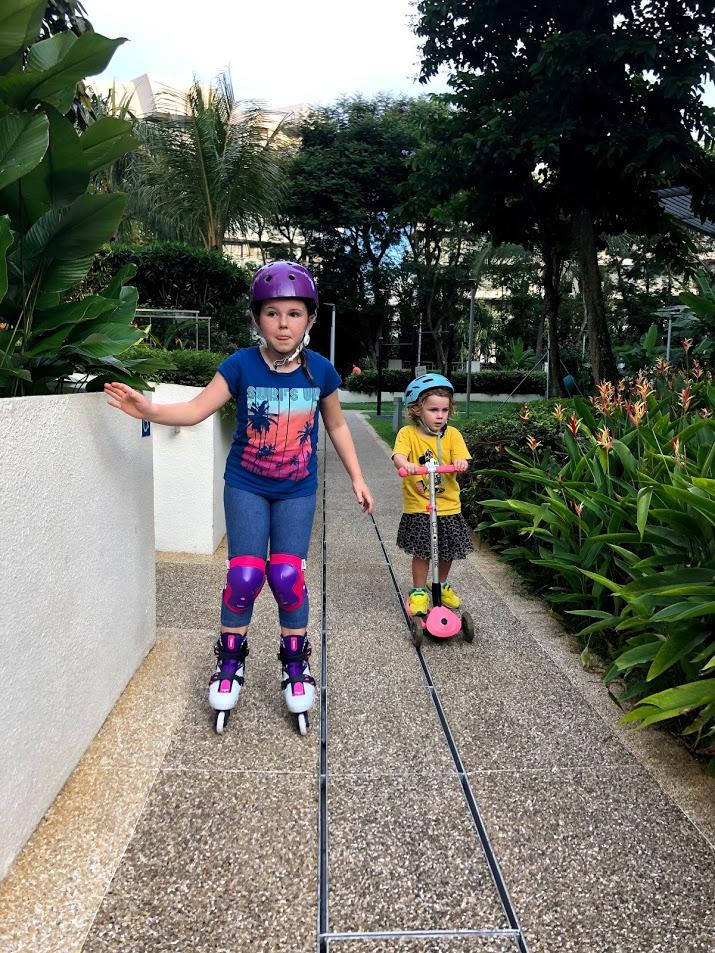 MsC spent the late afternoon trying out her new roller blades. She had the hang of it well enough to give her friend a hand.