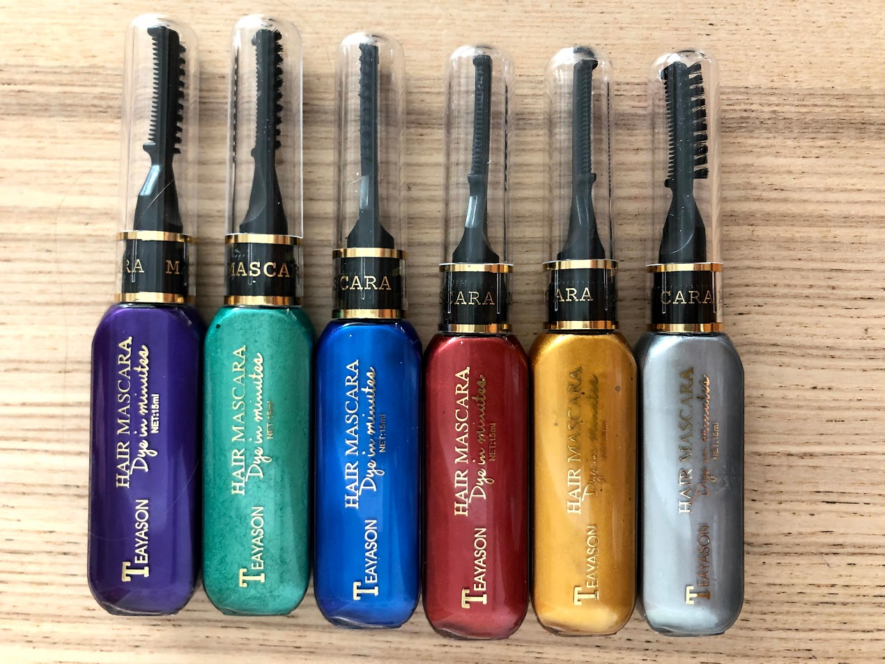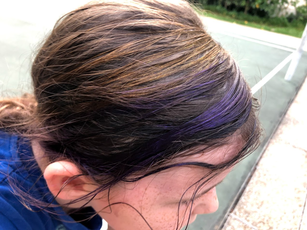We dyed streaks in MsC's hair with the new washable hair mascara before she went out to show her friends at the playground. We put purple and gold streaks on one side, and blue and silver steaks on the other.