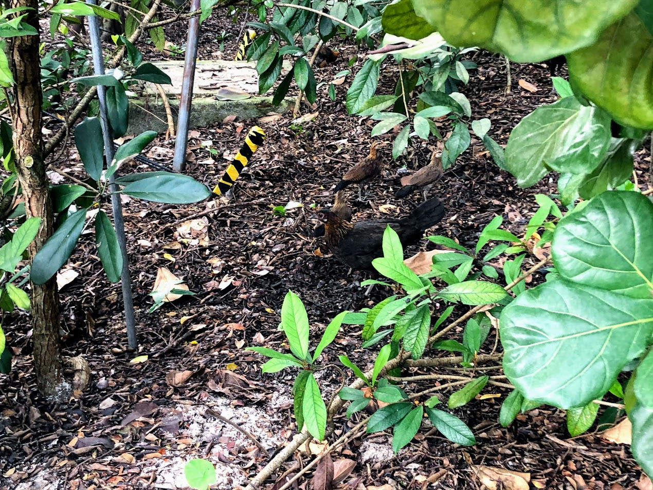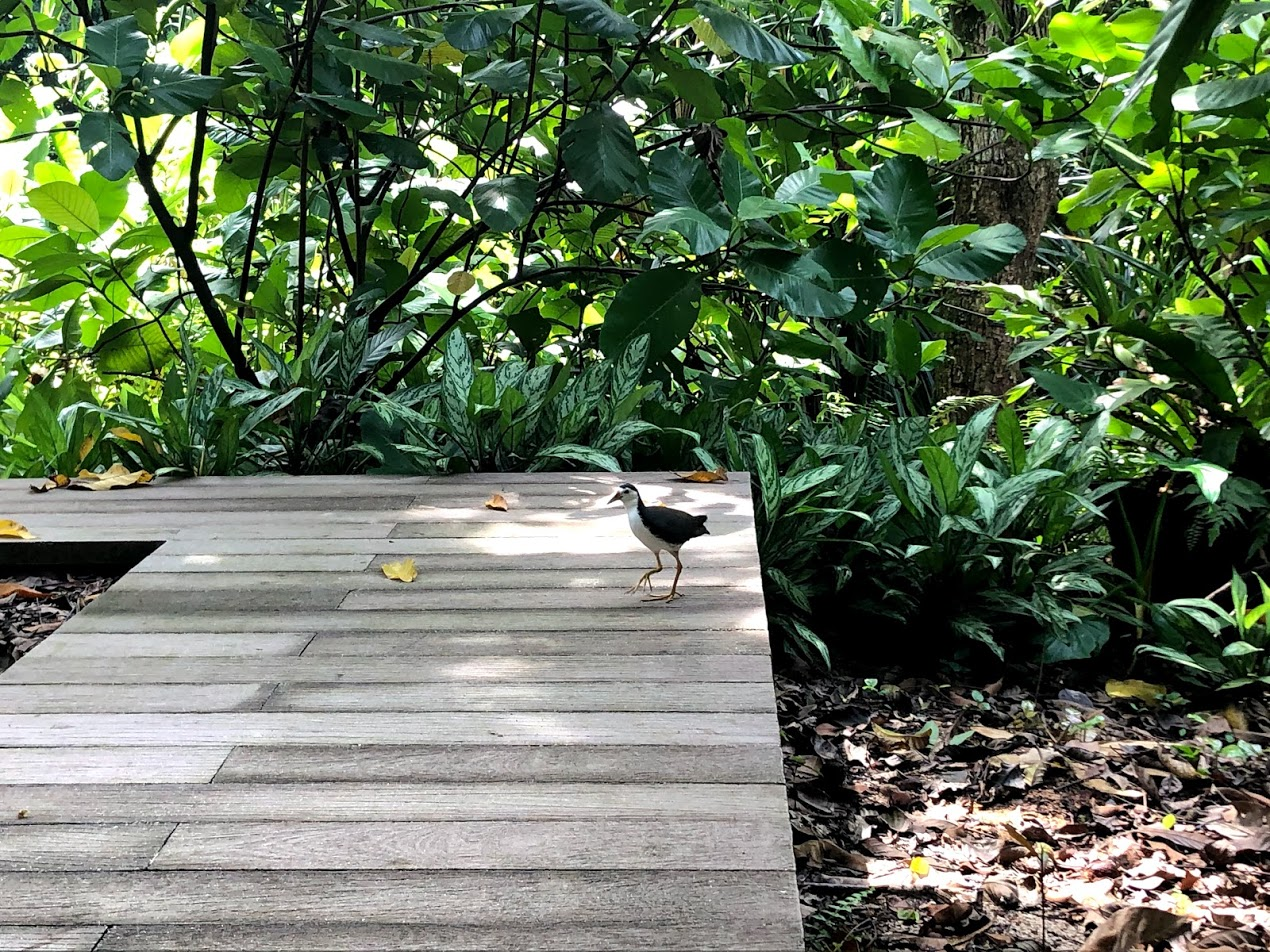 We found our fair share of wildlife in the park. MsE spotted the birds and I spotted the water monitor lizards. We saw a White-Breasted Waterhen. It reminded us of a chicken, scratching though the leaves. When we startled it, it ran off, instead of flying away. Later we did find real chickens by following a Rooster's call. We watched the hen and her 3 half-grown chicks in the under brush. MsE was disappointed that she didn't catch a picture when the 4 of them ran across the path; She was holding the camera at the time.