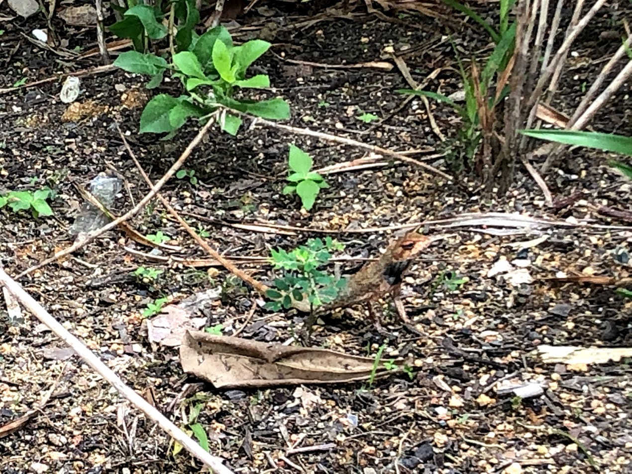 They're not all scary though. We saw a lizard. Sometimes these guys have orange heads, which seem to be the males. The female can be more green. I think they're an Oriental Garden Lizards, also called a Changable Lizards. These guys are not scary; they're only about 10 cm long. We spot them when they're moving. When they stop they're so well camouflaged they almost disappear.