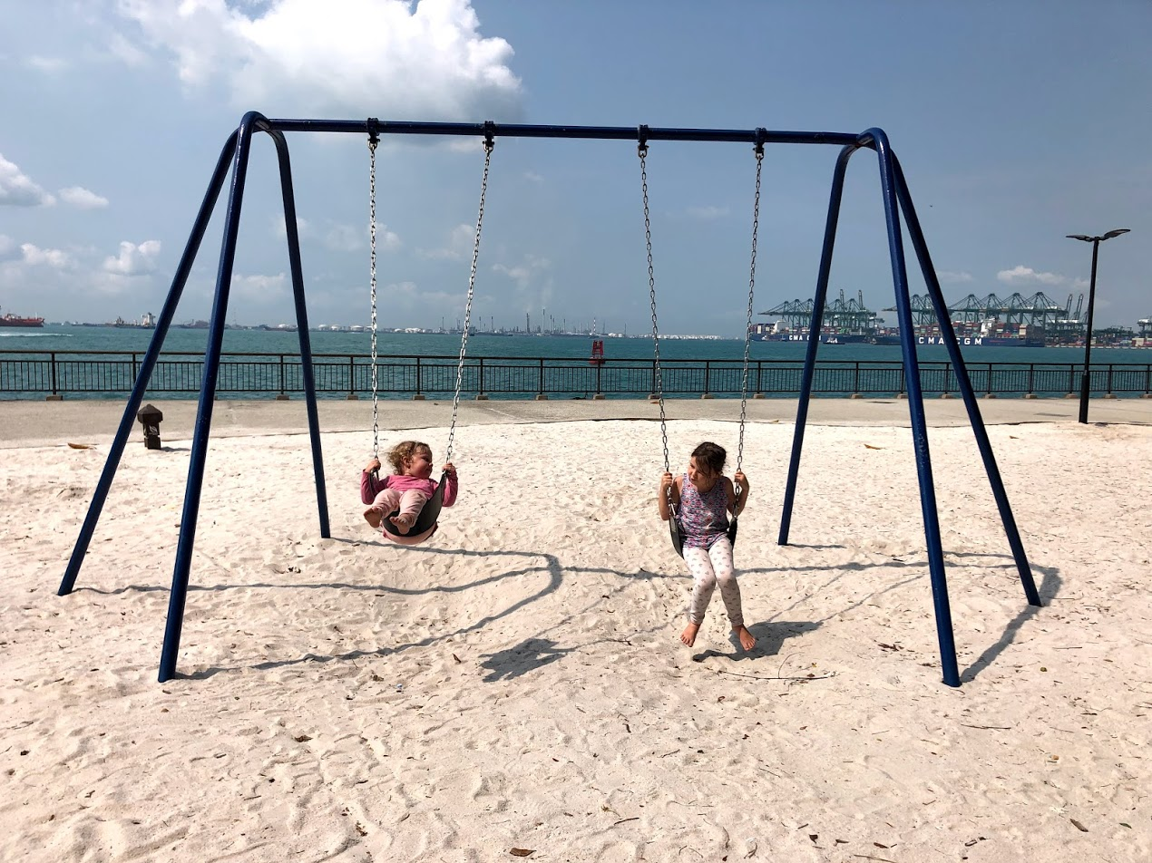 Besides our nature watching, we also visited one of the playgrounds. The park runs along the waterfront, but there's no beach access. We do kick off our shoes in the sand floored playground though. They girls find this old school playground with it's wooden teeter-totters, metal merry-go-round, and swing set quite novel. It reminds me of the playgrounds of my childhood - although much much much hotter.
