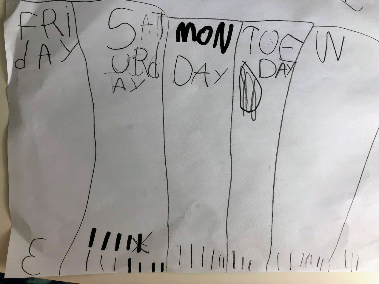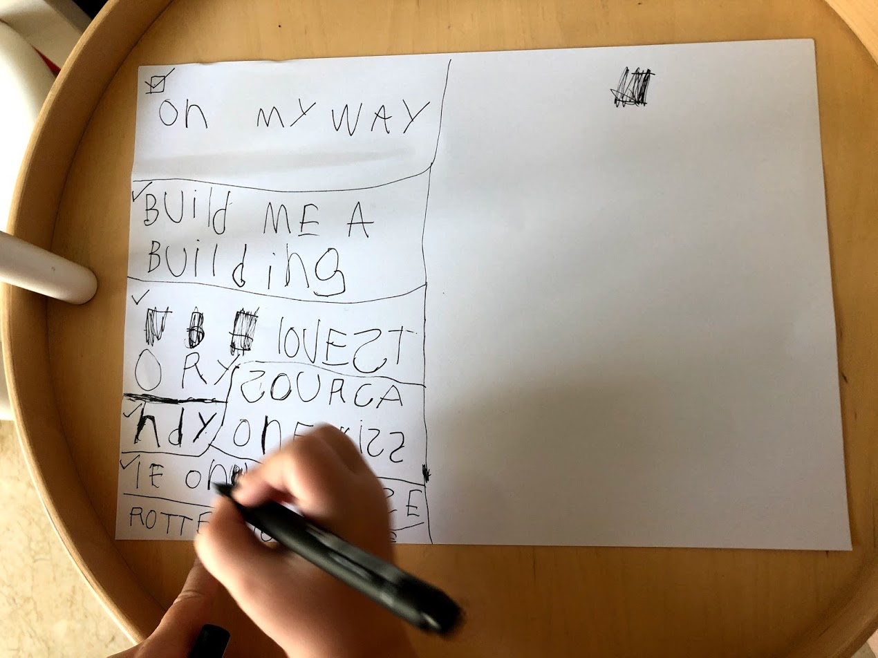 I've noticed that MsE writes unprompted as part of her play every day now. She used the search feature on Apple Music, sounding out the words herself, and then copying out the song titles as she listened to the music. She's been making charts for herself and keeping track of the occurrence of certain activities with tallies.