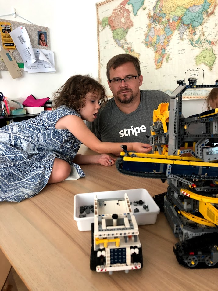 The girls learned about machines, gears and conveyor belts by testing out Jonathan's newest Lego Technics machine. MsE loaded the loose parts into the scoops, and then watched them drop onto the conveyor belt, where they traveled along multiple belts to make it all the way to the dump truck awaiting them. Jonathan later re-made the kit into another machine which used conveyor belts again. In the second version the girls were able to see how machines are able to sort parts by size.