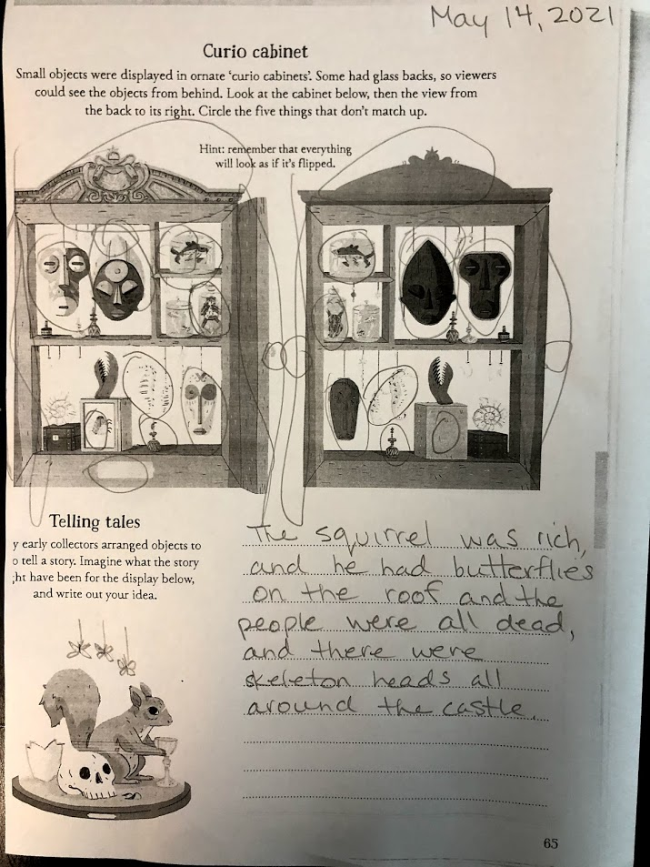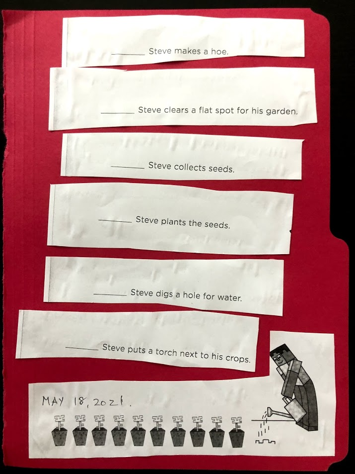 MsE did some reading comprehension activities, summarizing aloud passages read to her and also reading and sorting sentences into the order they happened in the story.