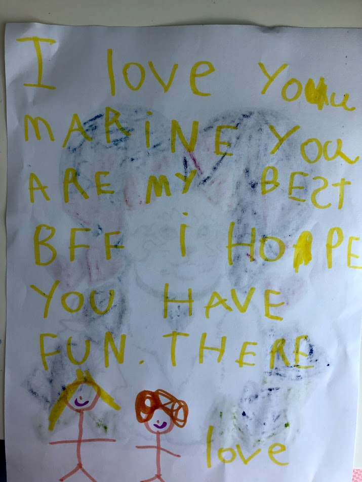 One of the girls' best friends has left Singapore to visit her family. Assuming there is still a 3 week quarantine when she returns, she will be away for about 3 months. The girls made and dropped off letters to her the morning she was to leave. MsE only asked for a little spelling help.