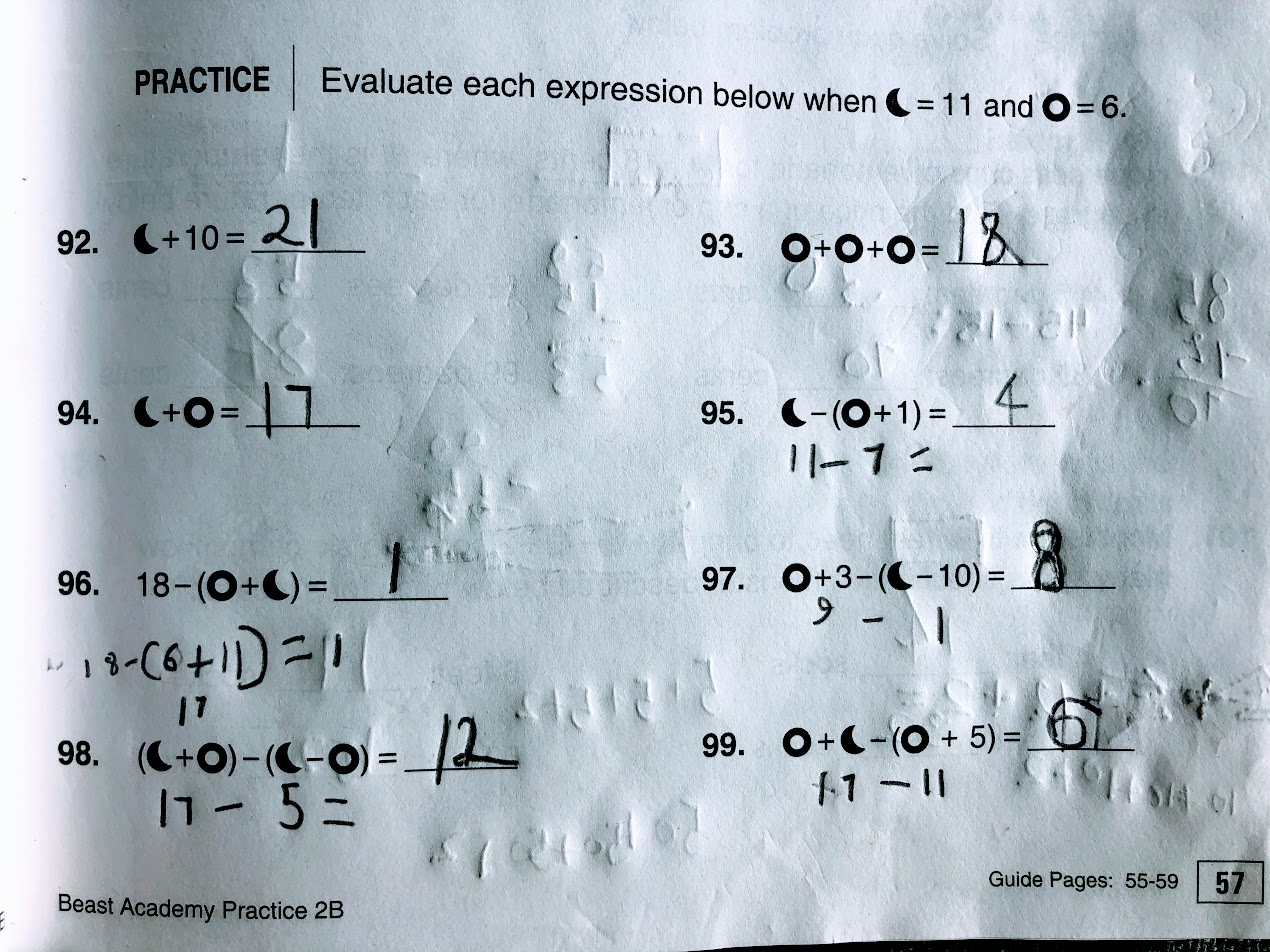MsC's Beast Academy lessons this month were about math expressions. She learned how to solve expressions using addition and subtraction with multiple sets of brackets (order of operations) and then symbols were layered into the work to replace numbers (algebra).