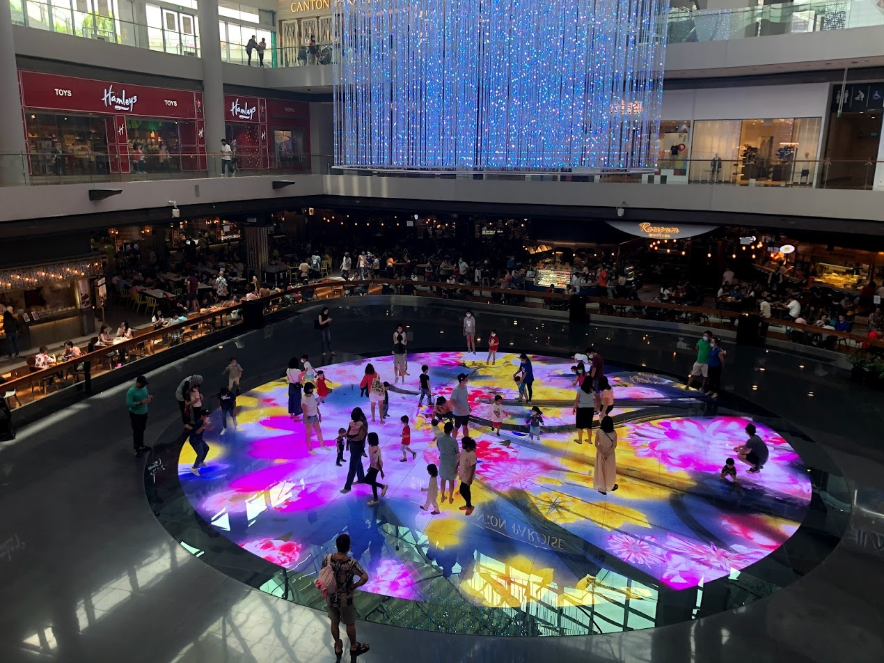 Inside the Shoppes at Marina Bay, there is a light installation that I really like. Seeing it with many people on it is very different, than watching a few children run across it reacting to the floor changing beneath them. It regularly changes the theme of the images. This time it was flowers, but my favorite has been the koi pond version. It looks like koi are racing up to greet the real live children as the children move across the circle. The light in the 3 story chandelier above moves through in shimmering waves.