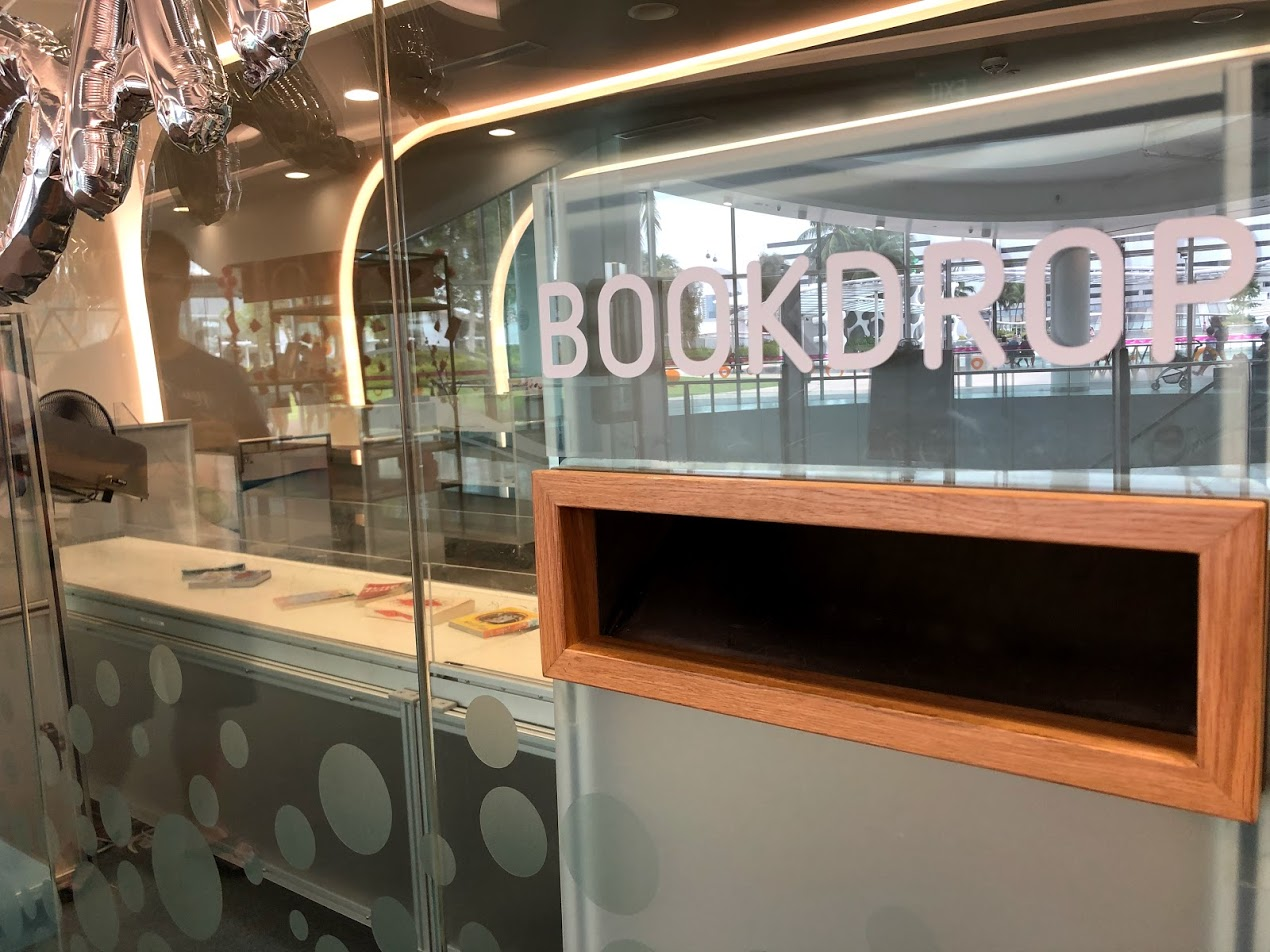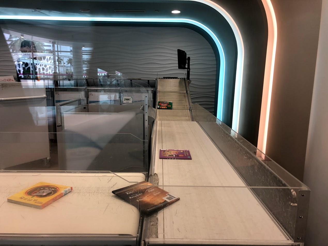As we drop a book through the book return slot, there is a loud beep as it is logged as returned in the system. Then the books go down the conveyor belt, where they are automatically spaced out. They go up to the sorting station where they are dropped from the conveyor belt into the correct bin for their section. The volunteer then only has to sort the section's books, and re-shelve.