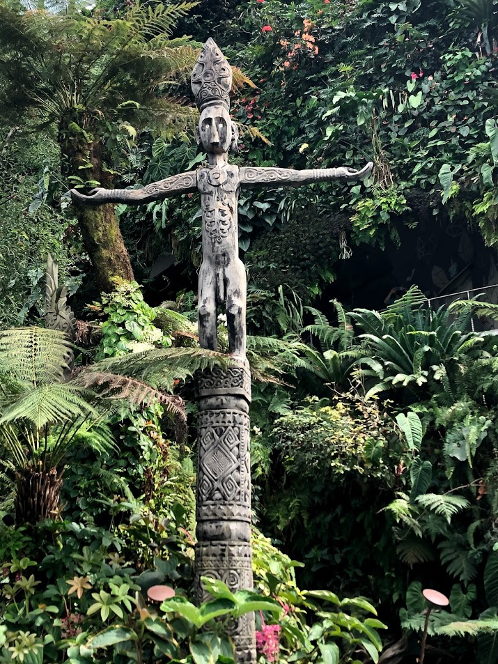 Tucked among the foliage were wood carved mythical and local creatures: dragons, sloths, parrots... We enjoyed spotting them. This dome was mostly green plants and trees. I spotted few flowers: a couple beautiful strands of orchids and some African Violets and similar occasionally.