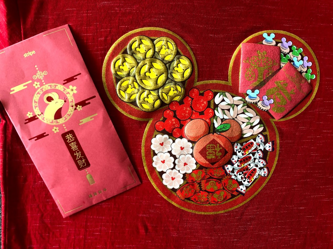 Being Year of the Rat, I could not resist all of the Mickey Mouse things I've been seeing. I ended up buying the girls red shirts with a mickey head shaped platter holding traditional candies, cookies, seeds, mandarin oranges and pamelo, ang bao red envelopes, and gold coins.