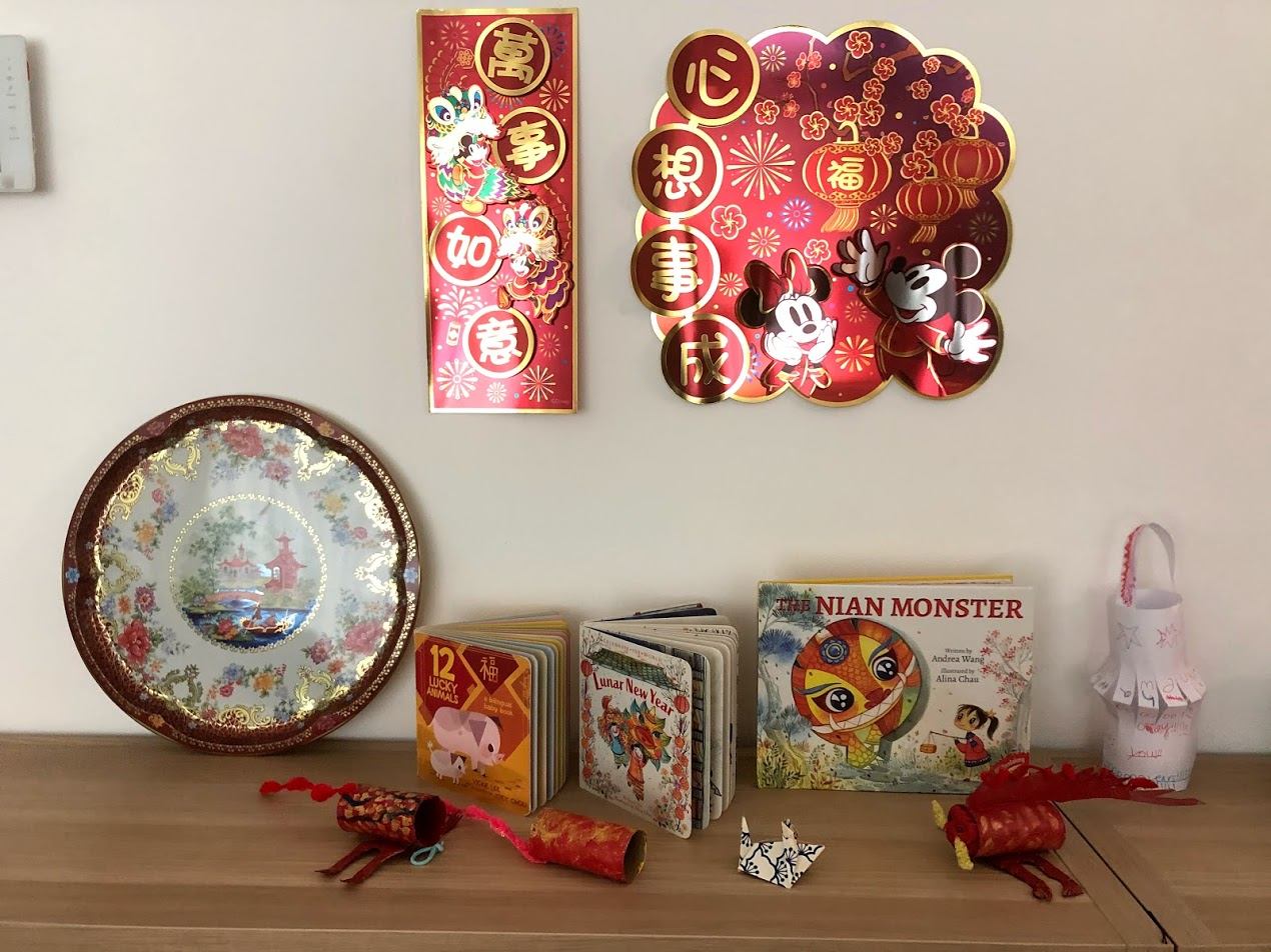 Before the new year hit, we decorated the house a little. I picked up 2 wall hangings with Mickey Mouse and good luck symbols. We coloured Rats and painted paper towel Nian Monsters. We made paper lanterns and origami Rats.