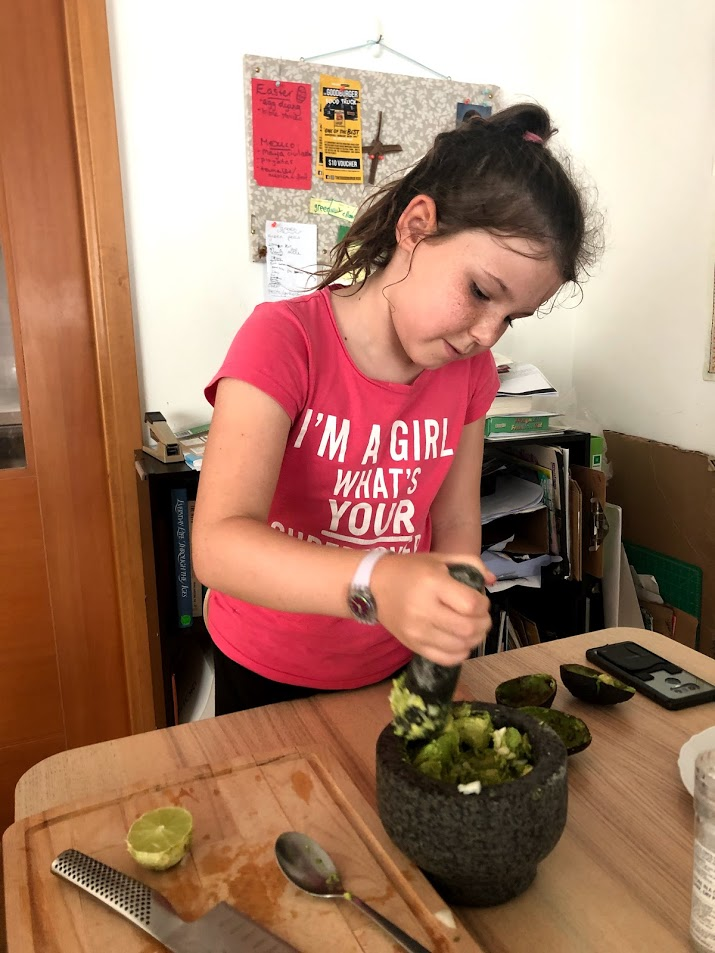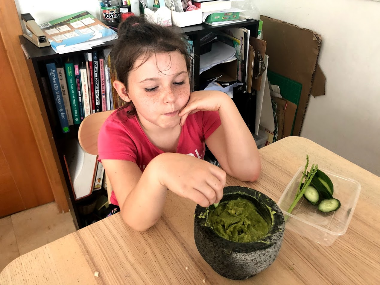 Later MsC made us homemade guacamole. She also ate the other half of the lime after using one side for squeezing some lime juice in to her mixture. MsC ate the guacamole with cucumber slices. She tried asparagus spears too. Dinner was lettuce wraps for burritos.
