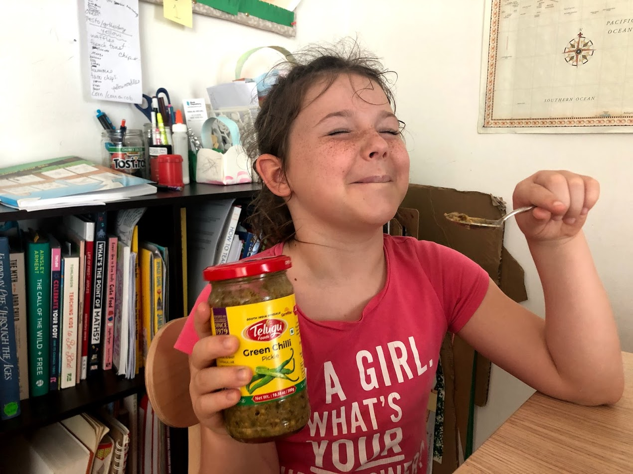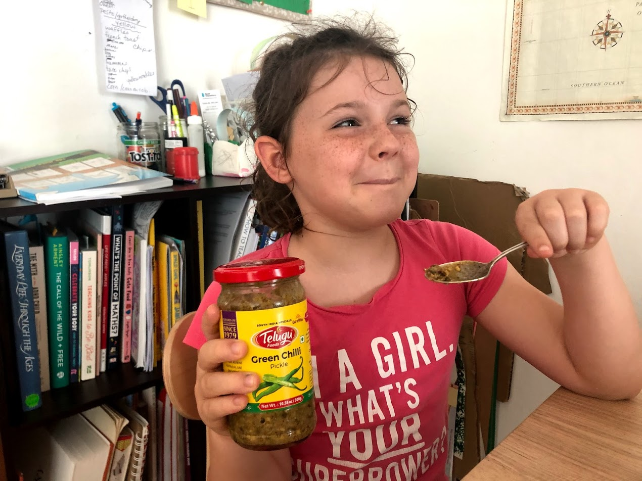 Being super brave, MsC tried her Dad's Indian Green Chili Pickle Sauce at the end of dinner. It's super spicy and Jonathan eats it on everything.