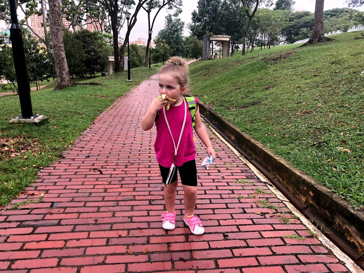 We went out for the day and the girls brought their snacks. MsC got green apples and grapes. MsE got yellow taco chips and a banana. We ordered Thai bananas for a change. They are much smaller and grow in a flat semi-circle, instead of a bunch. MsI wanted to know what was wrong with the bananas, but everyone ate them anyhow.