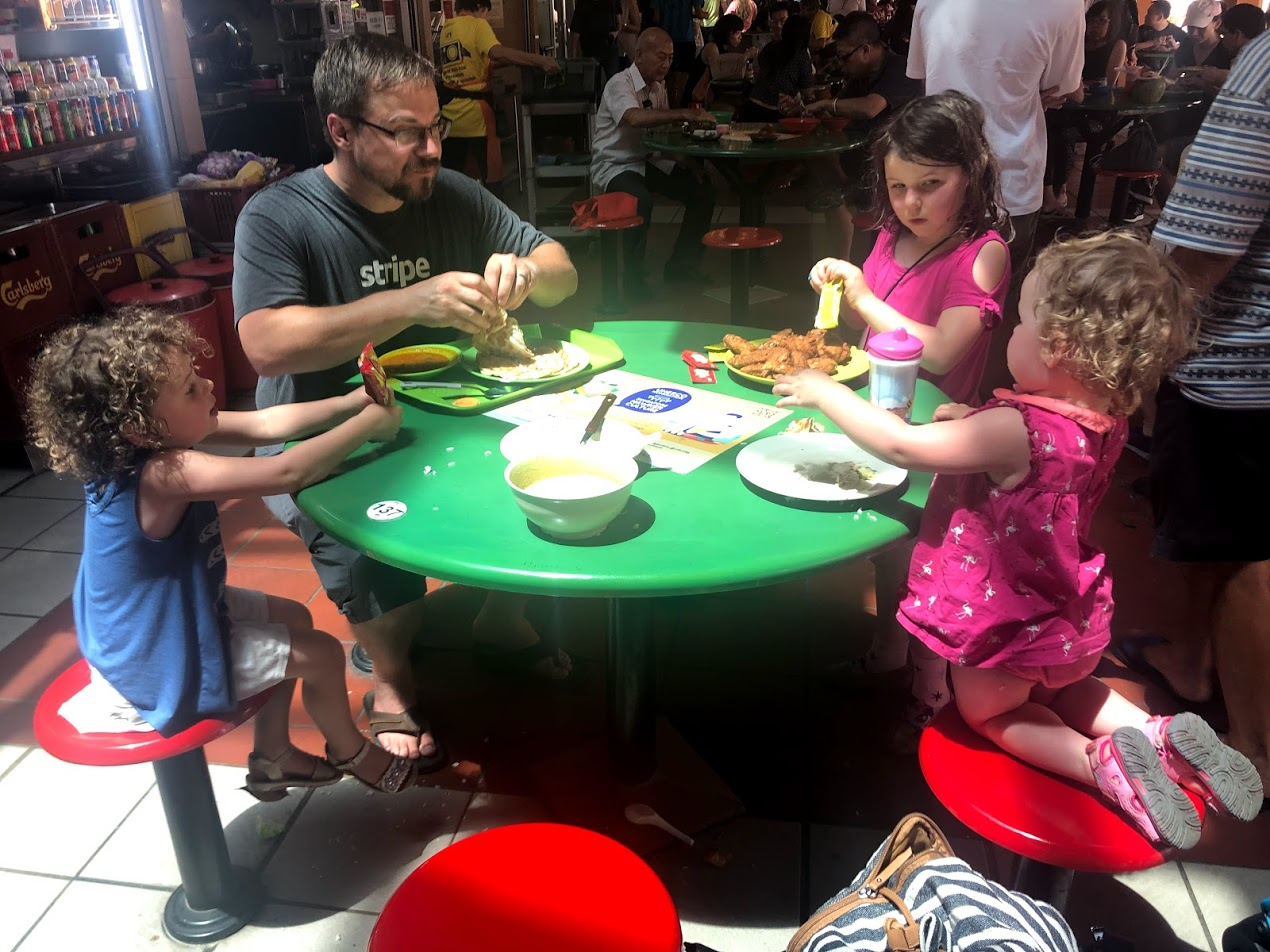 We walked up to Maxwell Hawker Centre for lunch. Ms.E insisted on what she calls “Chicken and Rice” - Red Thai Curry. I could find Green Curry, but Ms.E was not impressed. Everyone else thought it tasted how we would expect red curry to taste in Canada. Ms.E just ate the plain white rice and I consider it a win that she tasted one piece of the chicken. Ms.C got herself a giant plate of Fried Chicken Wings which she ate with ketchup. Ms.I eats everything. She looked hilarious chowing on a giant chicken wing. Jonathan had his favorite roti and curry.