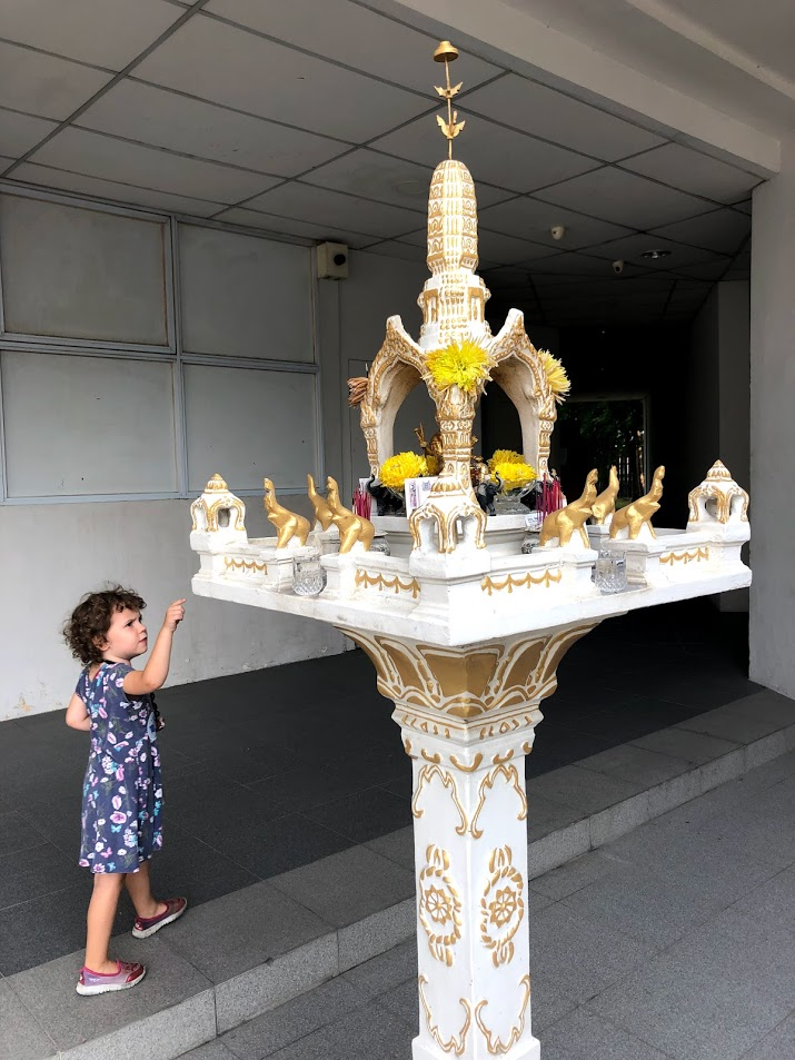 Our walk had started with Ms.E counting elephants at the little alter outside the lift (elevator) at the Drama School. We see little alters like this all over the place. They seem rather randomly placed around businesses. If you look closely at the alter, you can see paper money beside the black elephants and also the red incense sticks.