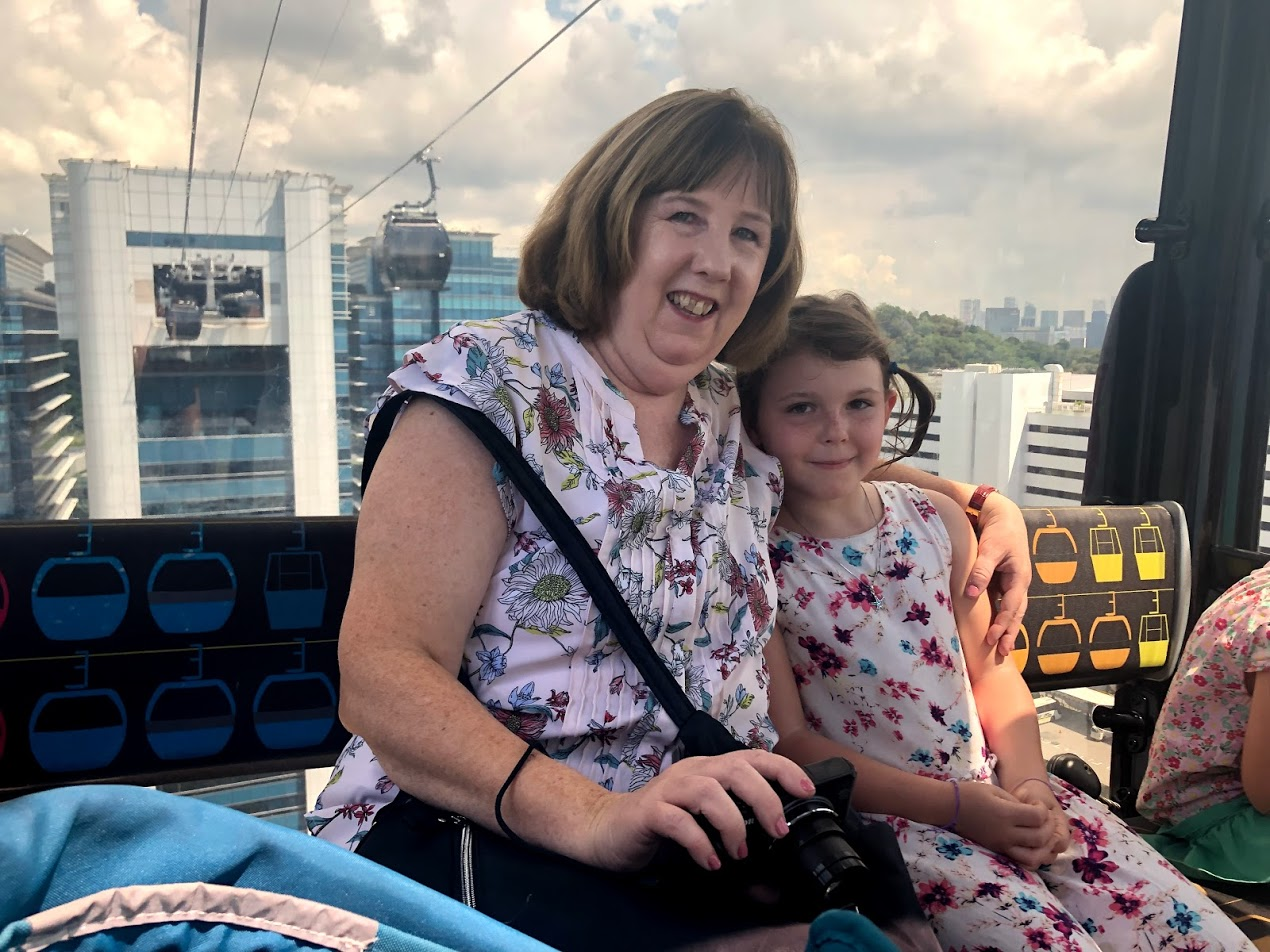 Our guests bought the Annual Pass for the Cable Cars for $20 each (the cost of 2 trips), and then we headed out to explore Sentosa Island. Mom didn't seem to mind the heights too much; it is a beautiful view. We pointed out the Merlion and tried to get close, but it's blocked off all the way around it now in anticipation of it's upcoming demolition.