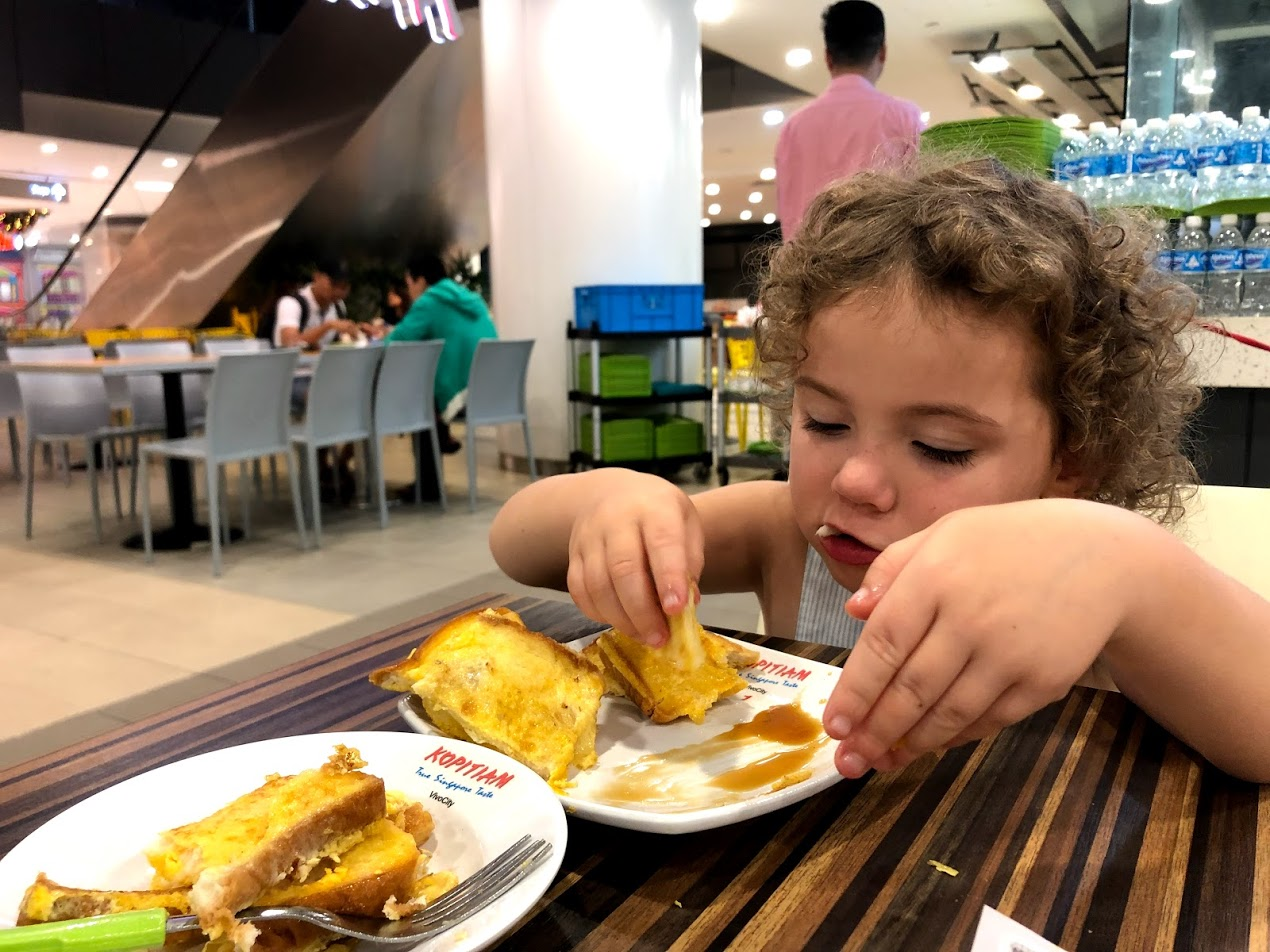 I left 2 sleeping girls in the care of our Helper, while MsE and I headed out for french toast and kopi (Singapore's coffee). It was fun walking Jonathan to the MRT on his way to work.
