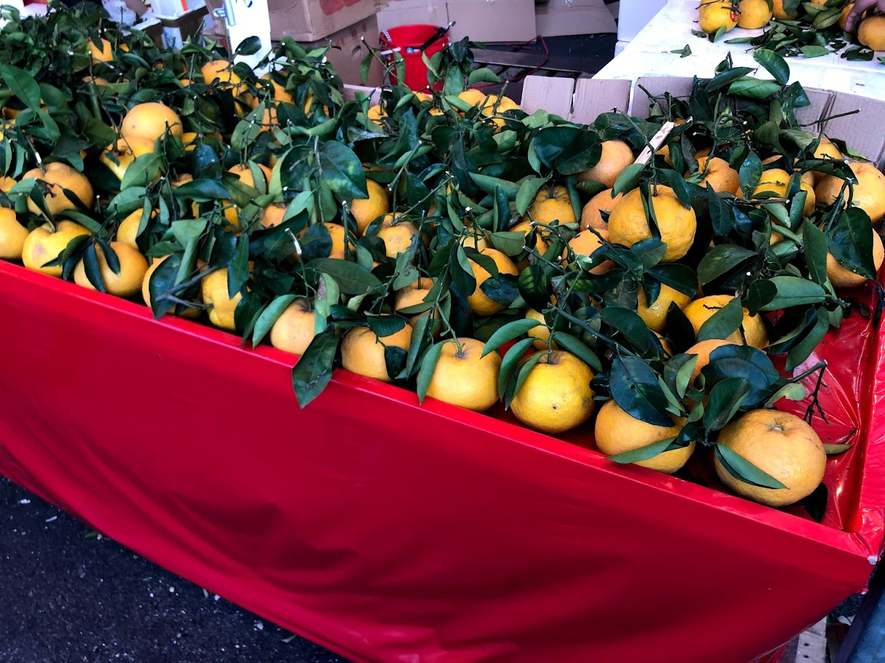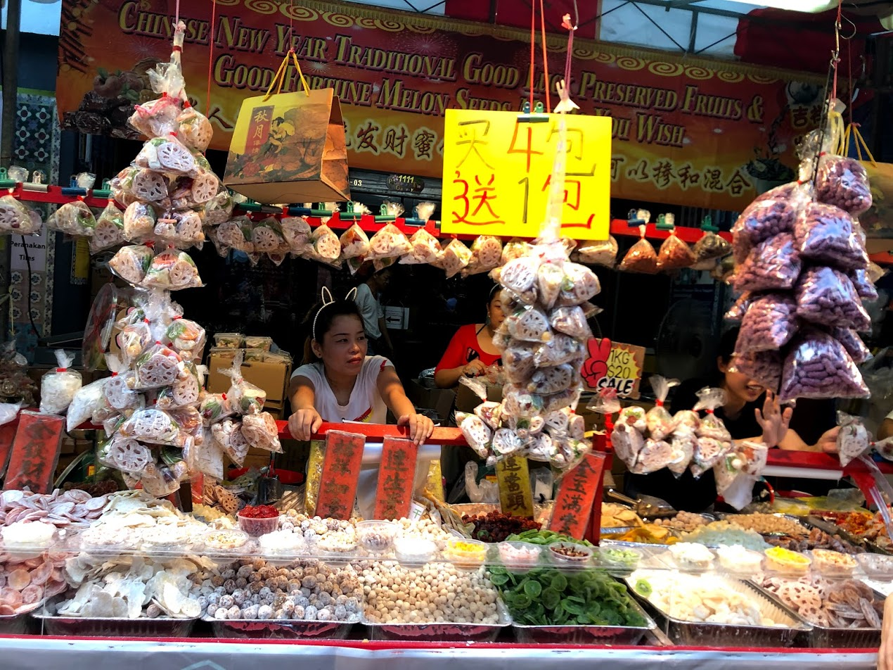 On the eve of Lunar New Year we went to Chinatown. You could really feel the excitement. It was way busier than normal. The usual "Festive Market" had whole streets added to it selling mostly traditional treats. Foot traffic only. We bought a bag of mandarin oranges for $1 (I wish I had bought a few bags) for our snack. We saw long tables selling Pomelos, Persimmons, and Durians. There were stalls selling roasted melon seeds and peanuts with flavours like licorice, garlic, or plum.