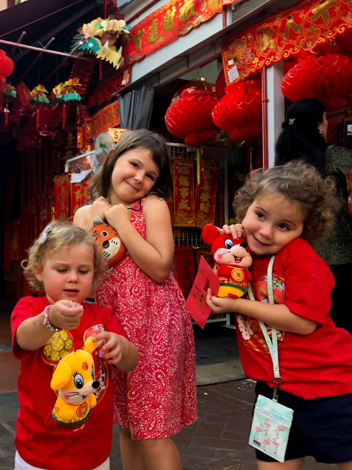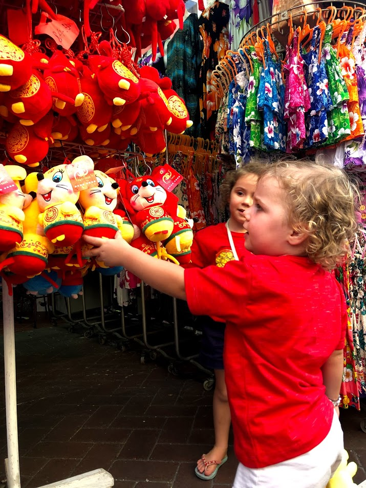 We had given the kids Ang Pao - money in the Red Envelope and let them loose in Chinatown to buy souvenirs at the stalls. MsC spent a solid 15 minutes trying to decide between a red stone and green stone for the necklace she was buying. The rest of stood in the narrow street trying to stay out of the way of the people squishing by. In the end MsC picked red to remind her of Chinese New Year and got her name engraved in gold. MsE and MsI could have selected a dragon, but instead choose a Rat in matching colours. They haven't let them go since; they even came to the playground the next morning.