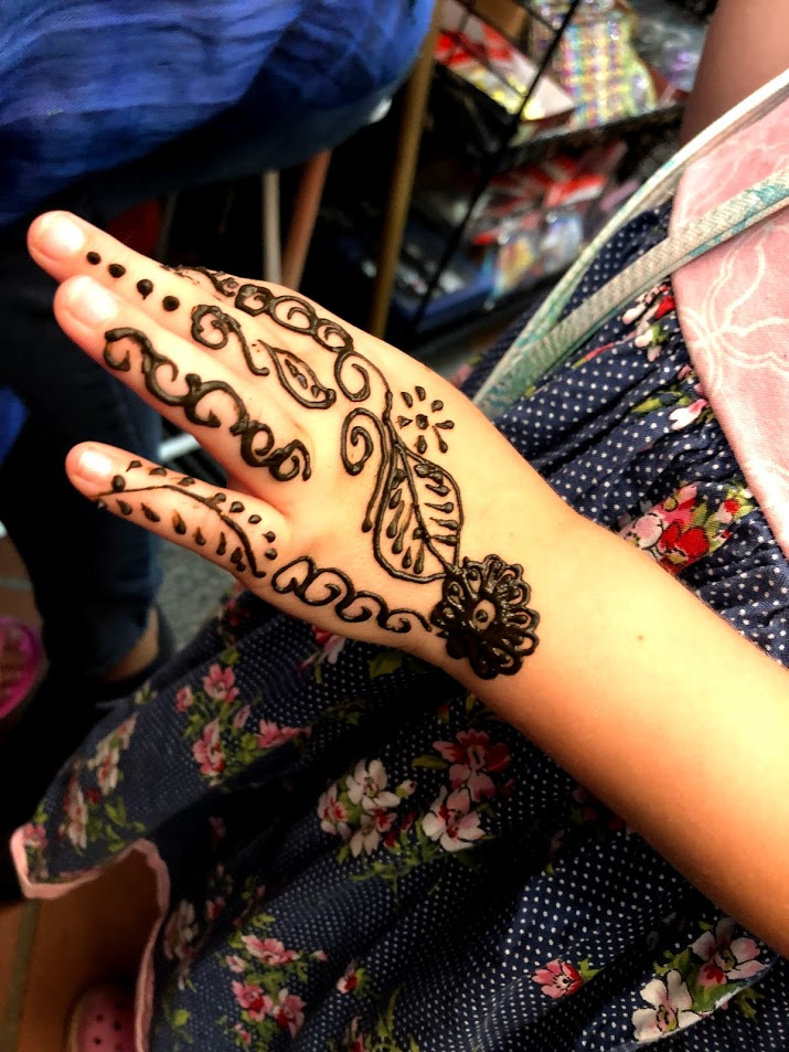 MsE and MsC each got henna done on one hand. They sat so still and then had to make sure not to bump their hands until the henna was dry. They made it about 20 minutes before they asked me to wipe it off. It's not as dark as it could be, but they marvelled over the fact that the designs didn't wipe off like face paint does.