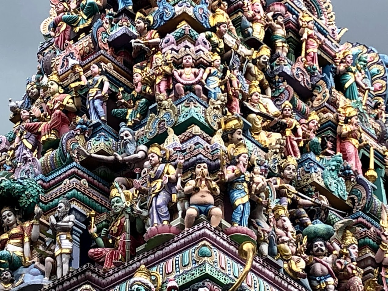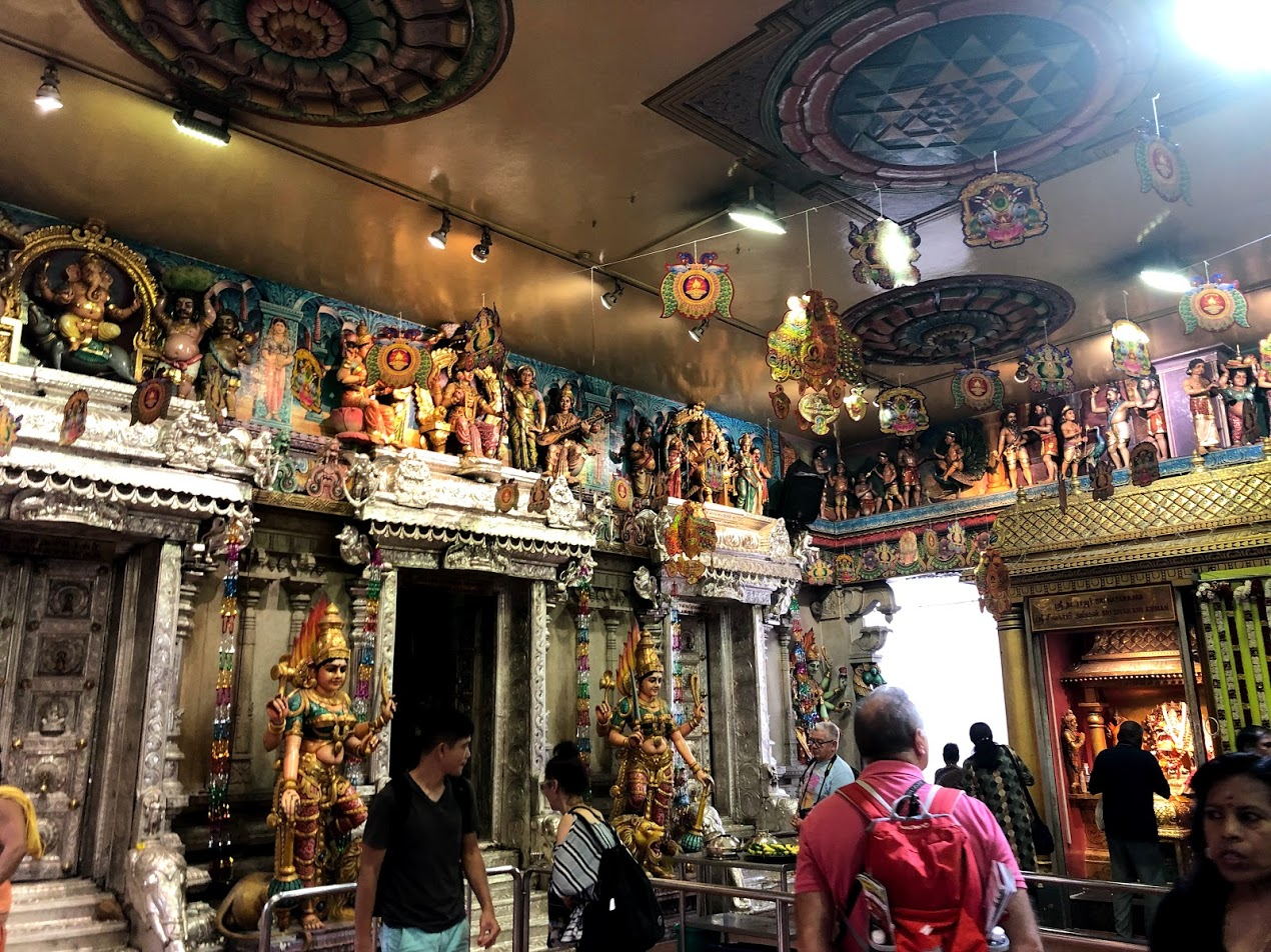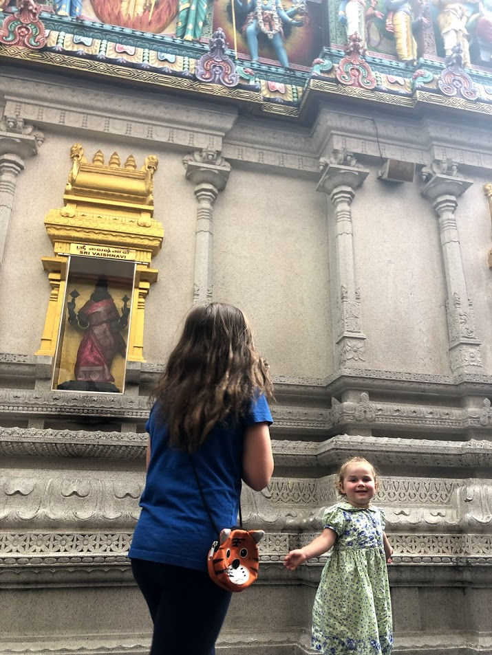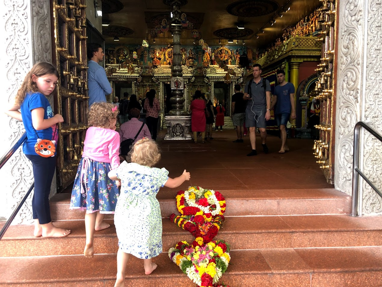 After the Market, we strolled down the street to visit the Sri Veeramakaliamman Temple. It was built in 1855 and is dedicated to the Hindu goddess Kali. The temple stands out with the gods all over it's roof, sandwiched between the corner of the busy road and the modern Hilton Hotel. Even the baby took her shoes off to enter the temple. I made sure all our shoulders and knees were covered even though I saw a number of people leaving in shorts and tank-tops.