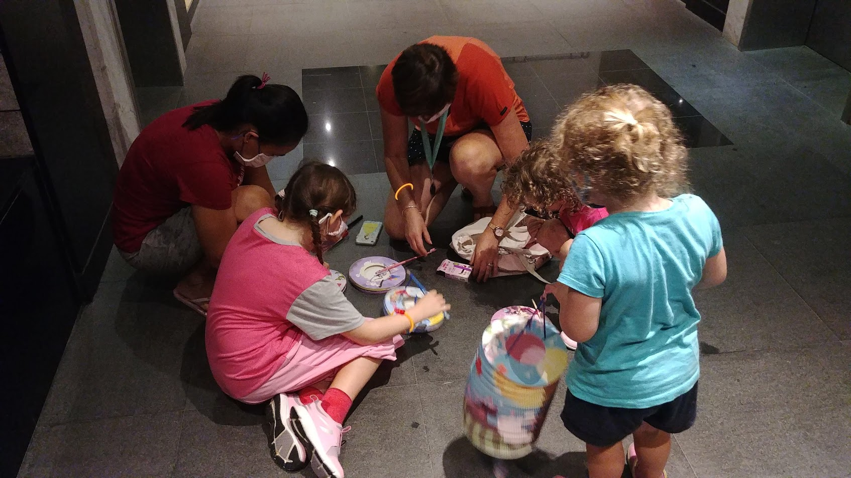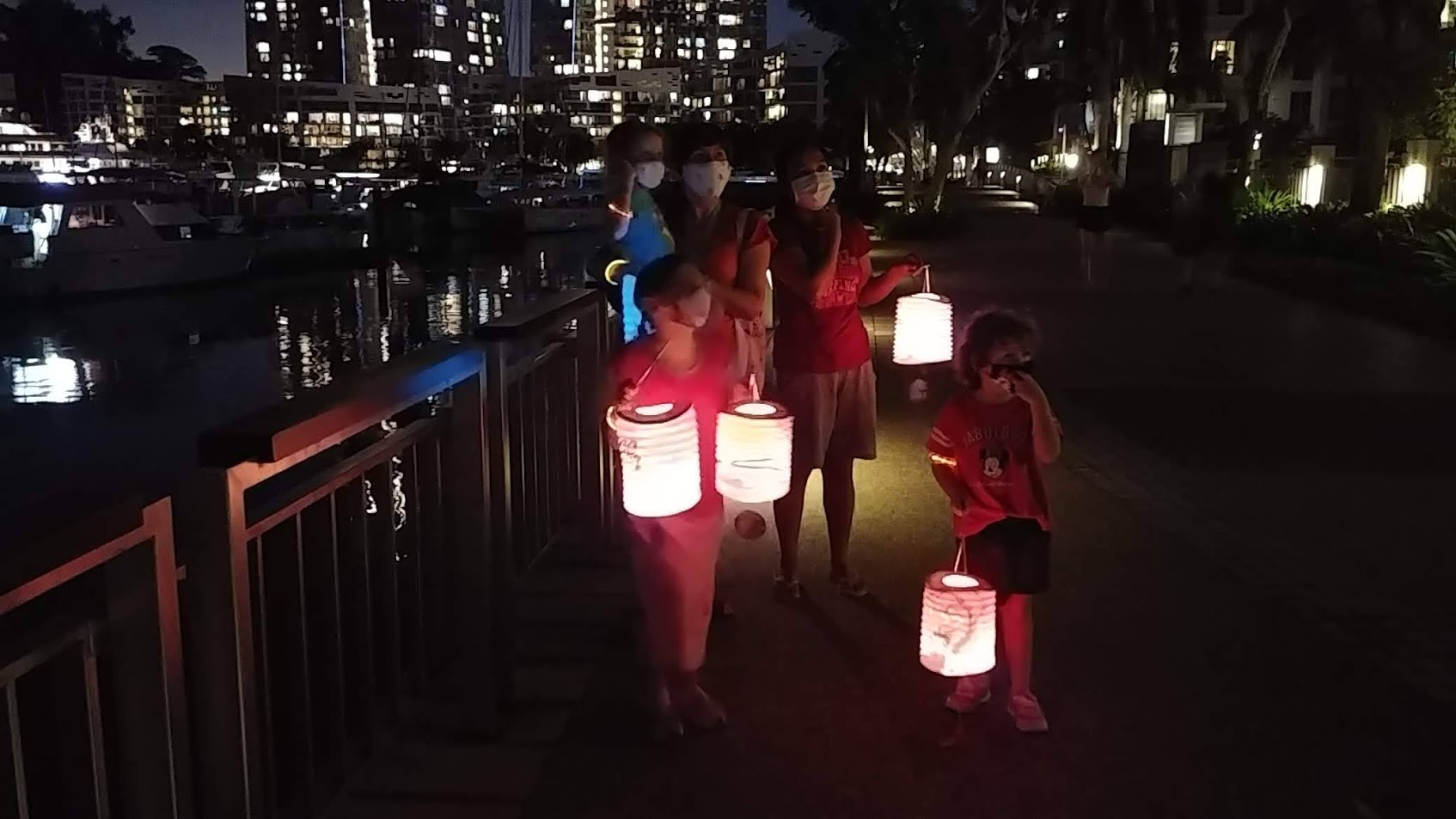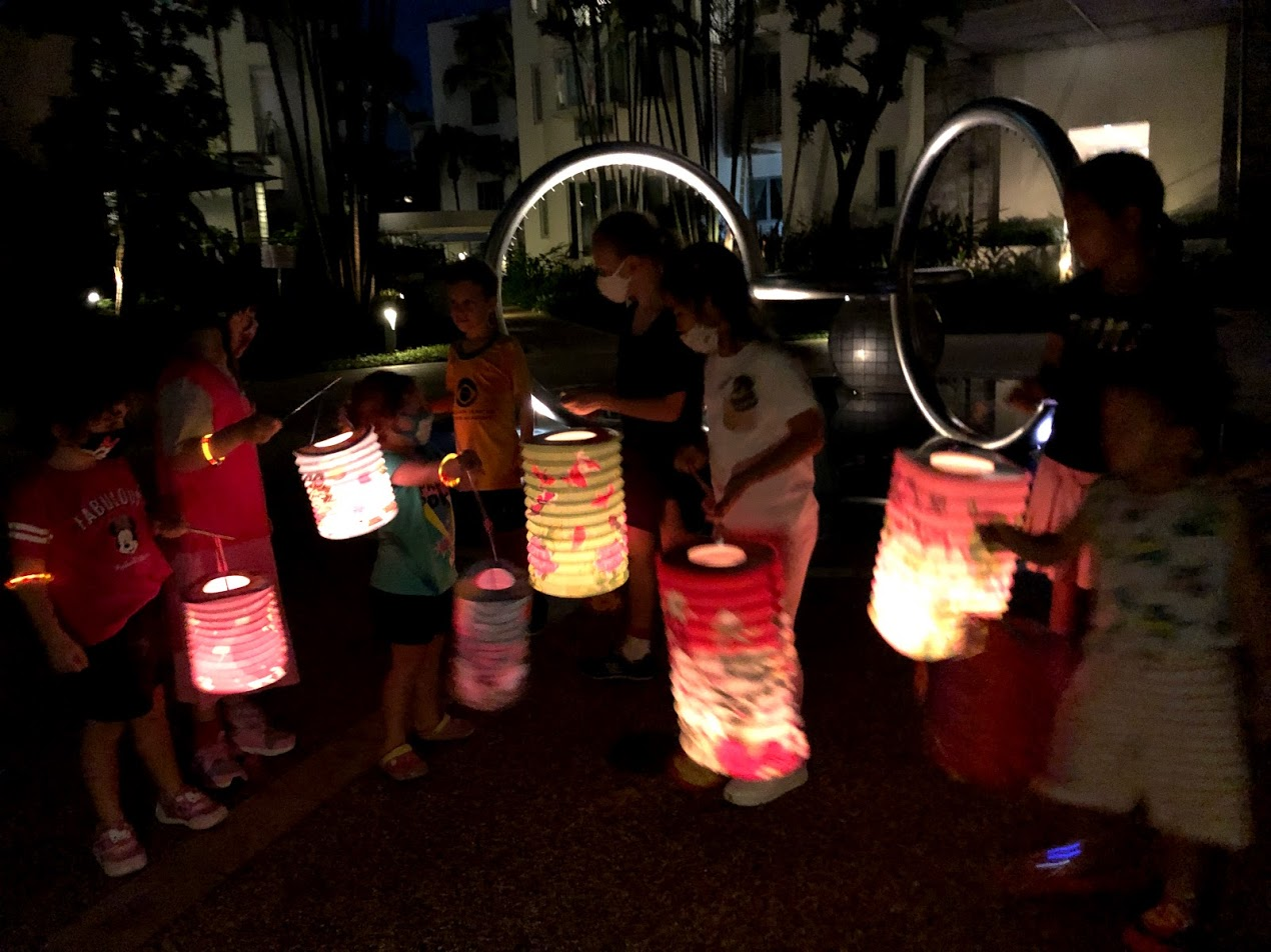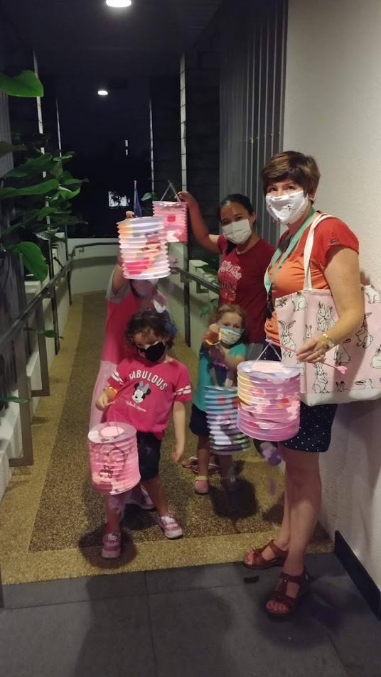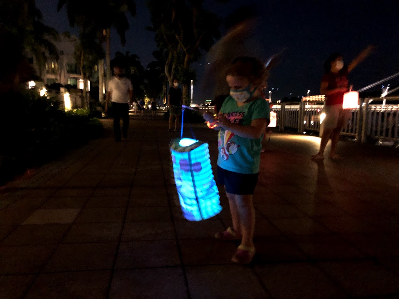 Last year our condo complex hosted a big buffet dinner for residents, provided entertainment, and then handed out paper lanterns to all of the children for a lantern walk. There was none of that this year due to COVID, but we did see children in small groups out like us with their lanterns. One of the groups we passed even had 3 of the girls' closest friends. We were excited to spot them in the dark and exclaim over their lanterns. We snapped a picture as we met and passed by in opposite directions.