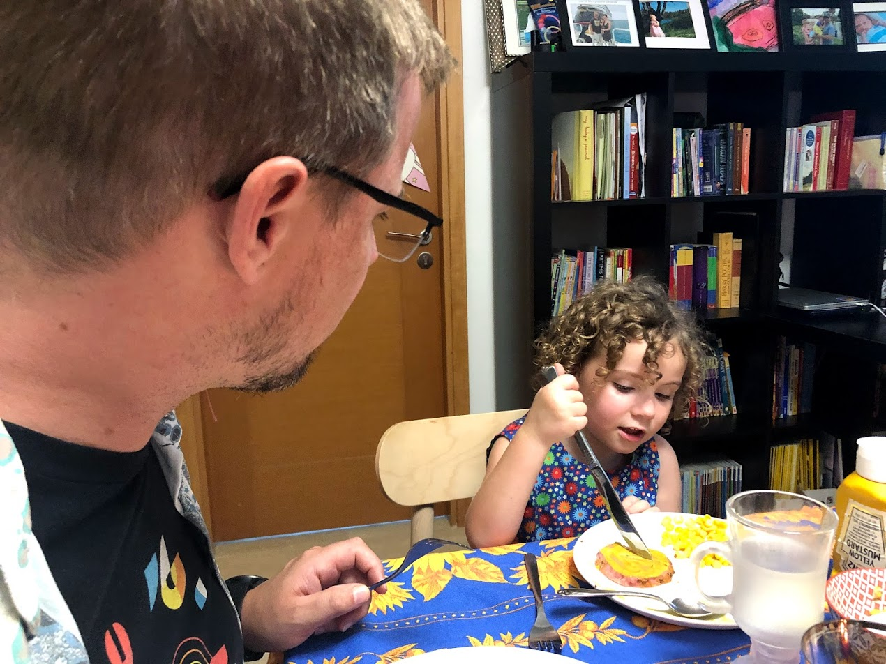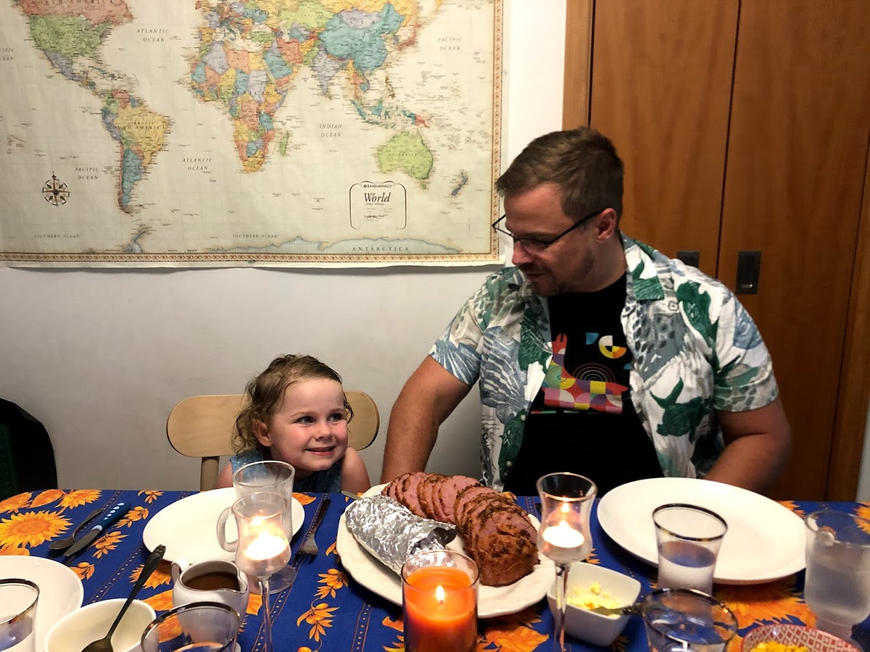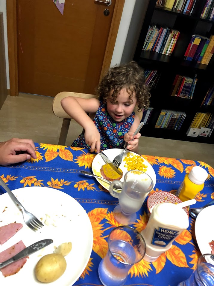 I made dinner myself, which never happens anymore (usually our Helper does dinner). We ate baked ham, green beans, potatoes, gravy, corn nibblets and garlic bread. We were surprised that all the girls ate dinner without complaint. MsE insisted that she cut her own meat, so Jonathan gave her knife lessons.