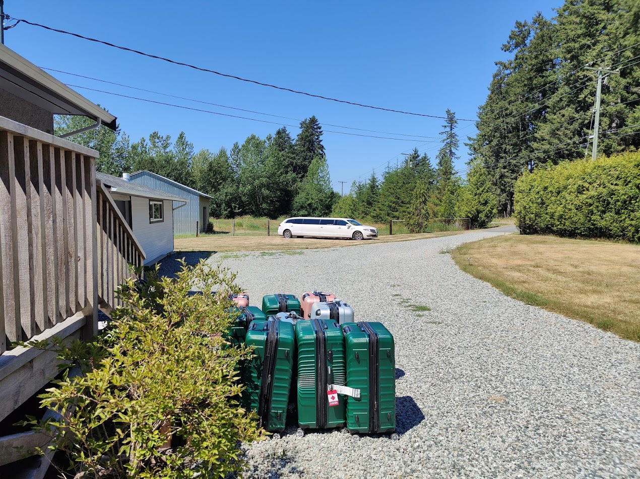 I told you we're used to being a spectacle, but again people had to stop and stare at us in Maple Bay, wondering what was going on. It took quite a while for the pilot, the dock hand, the driver and Jonathan to ferry the 15+ pieces of luggage out of the plane and up the dock. There are no luggage carts in Maple Bay. The dock hand used a rusty wheel barrow for our carry-on luggage. There wasn't much room to spare in the limo with all our luggage.