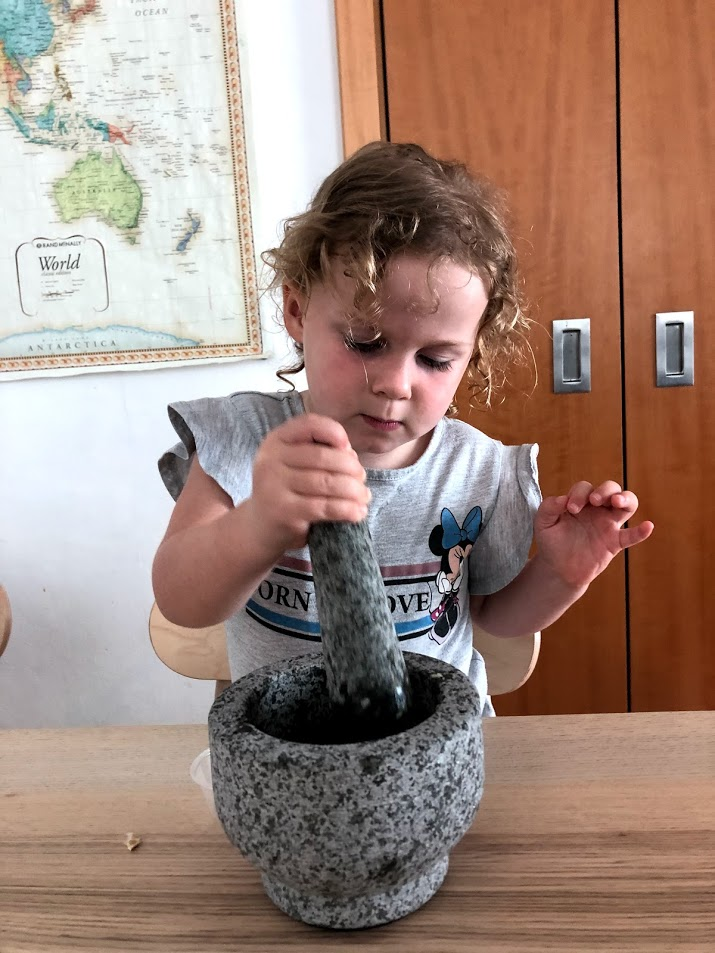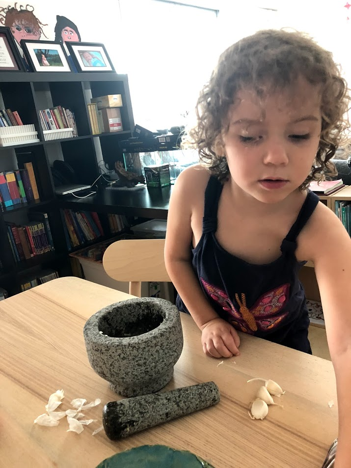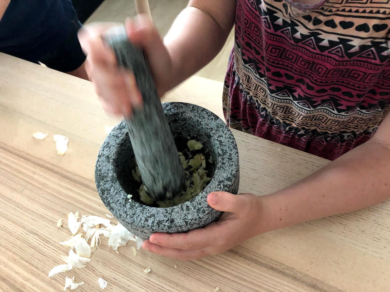 The Mortar and Pestle was invented over 8,000 years ago during this time. We happened to have one in the kitchen, so all 3 girls tried their hand at grinding garlic cloves. I considered handing over the hard Sichuan peppercorns we use to make Dan Dan Noodles, but they're more expensive and I was worried someone might get it in their eye. The girls liked that our Helper said she can use their ground garlic with tonight's dinner.