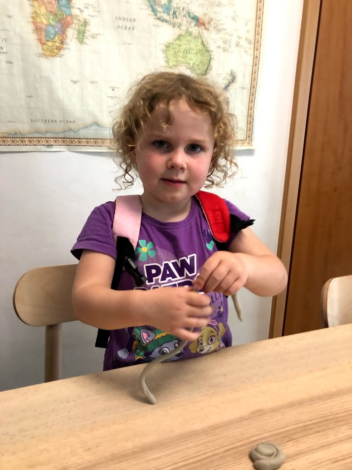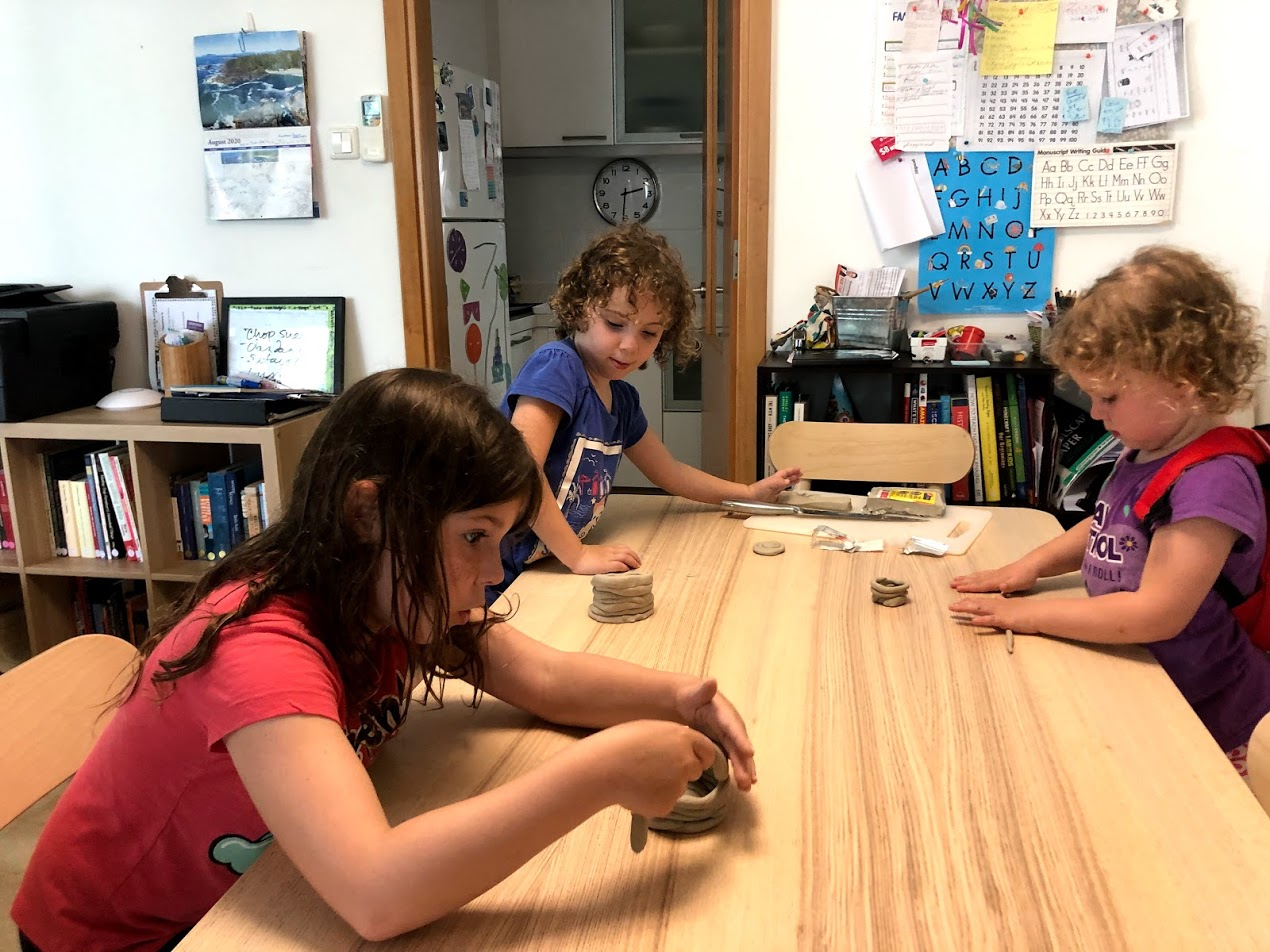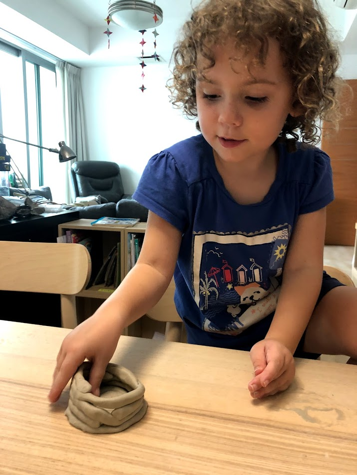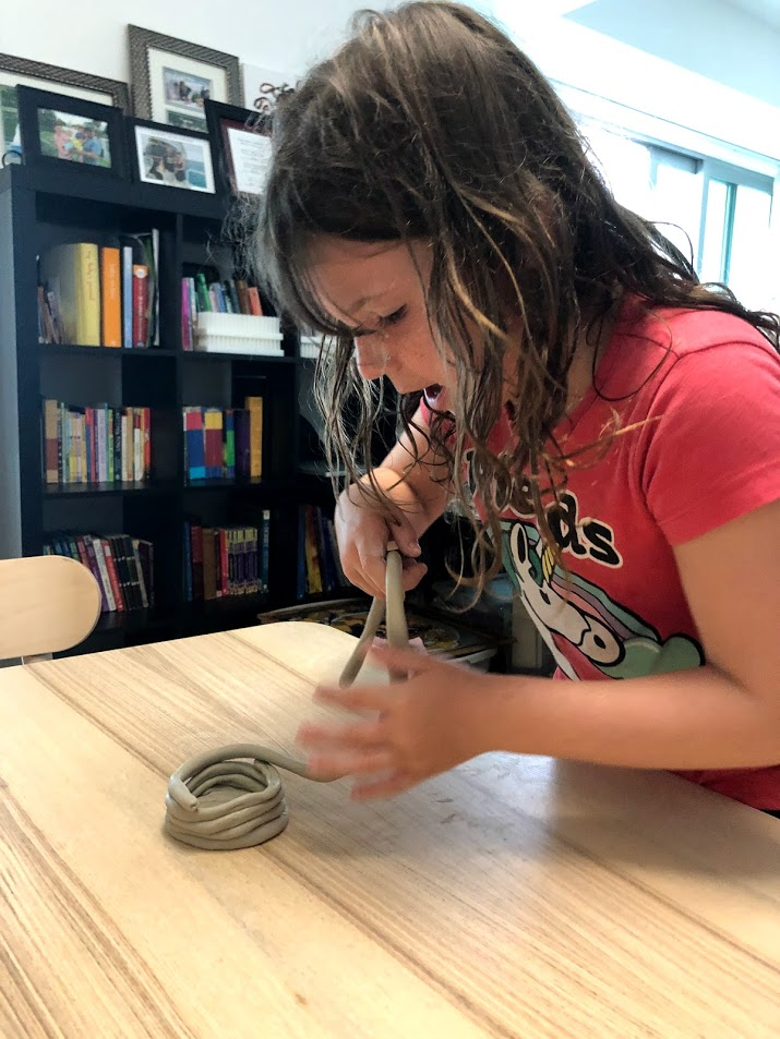 Another tool invented was pottery. I got a hold of some air dry clay and we tried the coil method described in our book as being used at the time. I didn't give the girls very much instruction on how to do it. After, we talked about how much better our pots would get after we had made 100 of them. Specialization of jobs is another thing that evolved in the Neolithic era.