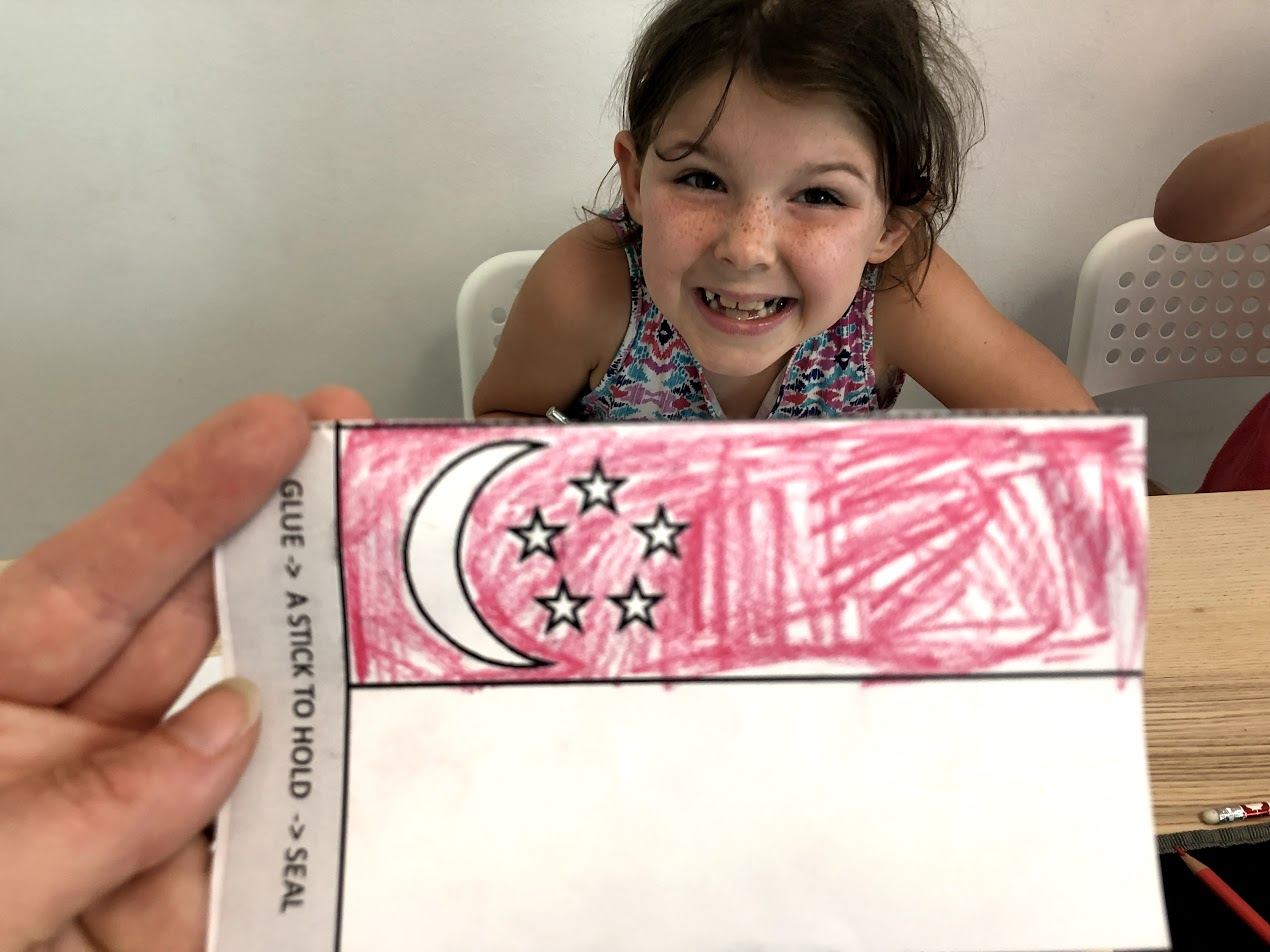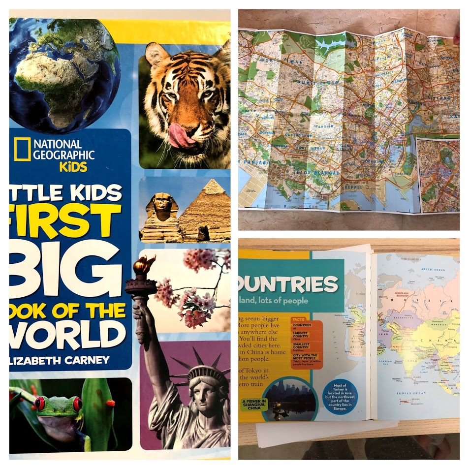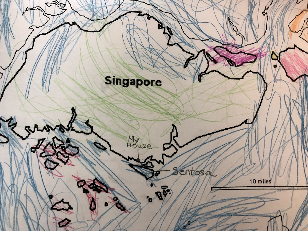 After our math work, we launched into Social Studies. We talked continents and who lives where. We know people from 4 continents. We read a bit from the Asia section of our "National Geographic Kids, Little Kids First Big Book of the World," found Singapore on the world map, coloured a Singapore map and flag. We used a detailed map of Singapore to find our favorite places, and added some of them to our maps.