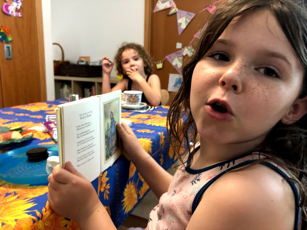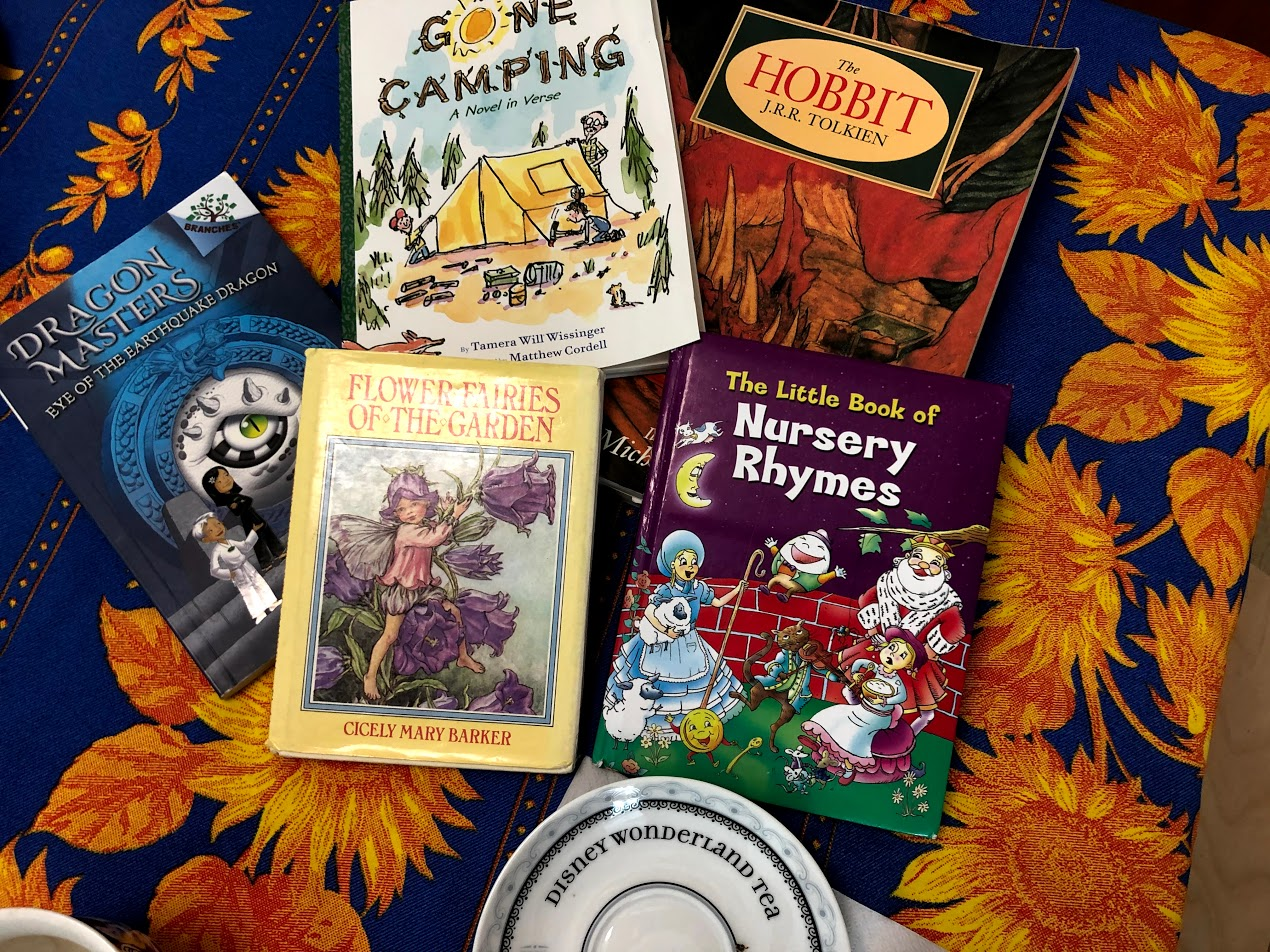 I read some poems from "The Hobbit", prompting MsC to run out and came back with one of the Dragon Masters books, so she could recite some of the poems found in that novel. MsI and MsE requested various nursery rhymes. MsC also read aloud from "Flower Fairies of the Garden;" It's always her favorite. We talked about how some poems rhyme and some poems don't.