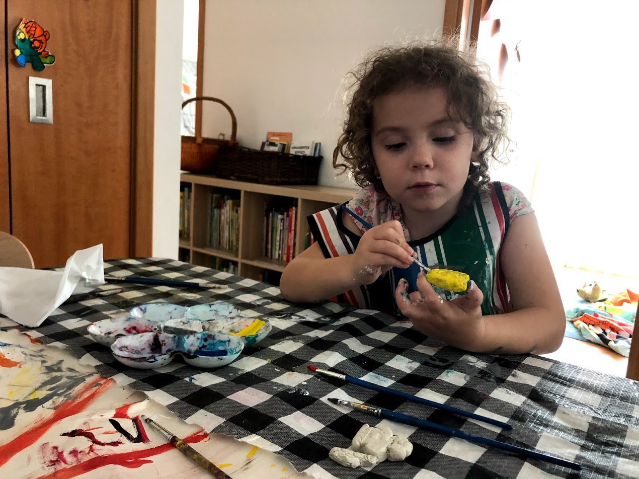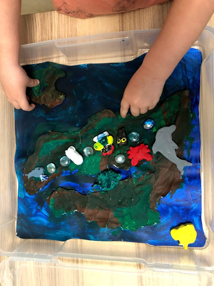 We finished off painting our clay island inspired by our read aloud book, "My Father Dragon." I've only actually seen MsI play with it so far. The had girls made some clay animals and I added some glass beads as loose parts. There's a man, dolphin, whale, crab, alligator, mouse and owl. I love hearing MsI's "Hoo, Hoo" while she plays.
