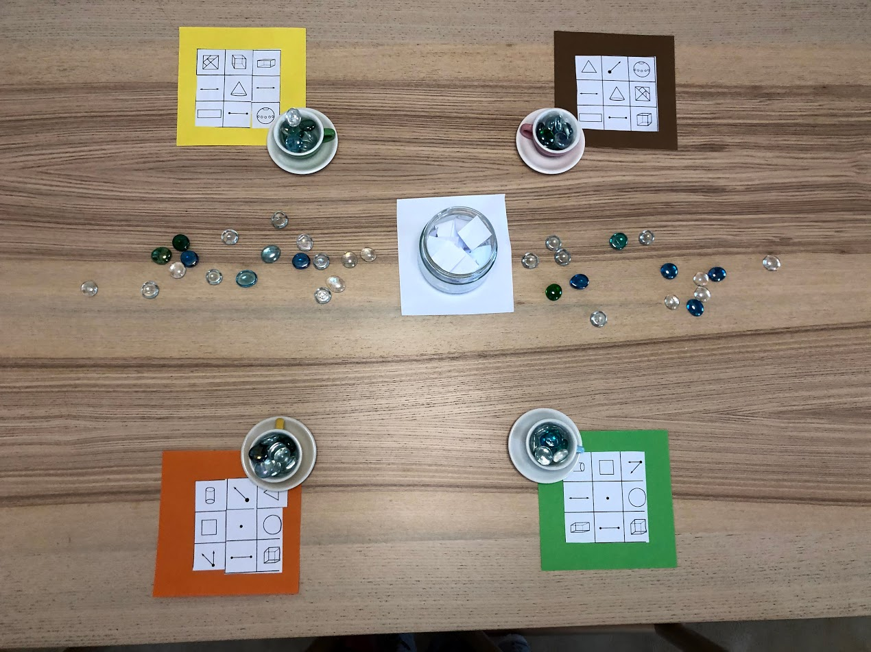 MsC's math book lead us into Geometry this week. I made game cards for the 4 of us from one of the activities in the book and we played Geometry Bingo together. I tried to make it very enticing by adding gems and our little tea cups to hold the markers. It was easier to get the girls to the table for this, than it is for workbooks. It was actually MsI who noticed the table first and gathered everyone up, because she wanted to play it. We helped MsI name her 3-D shapes; she knows the 2-D ones.