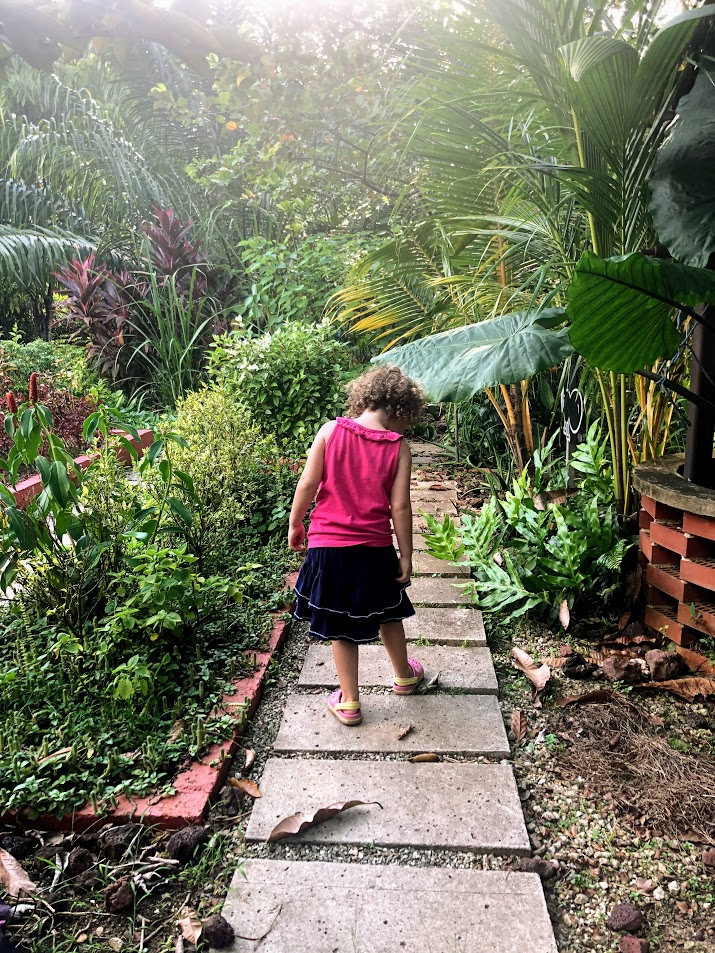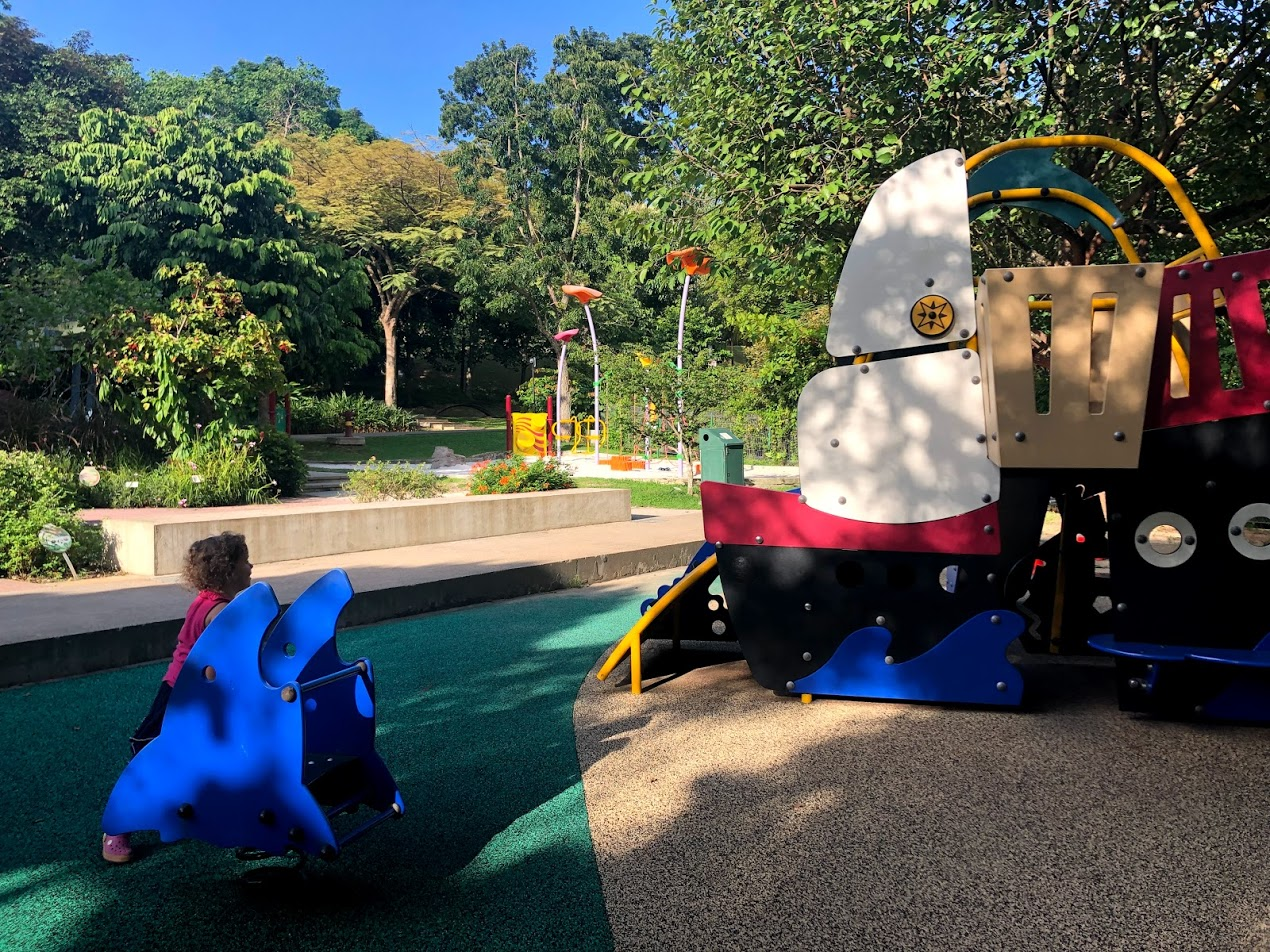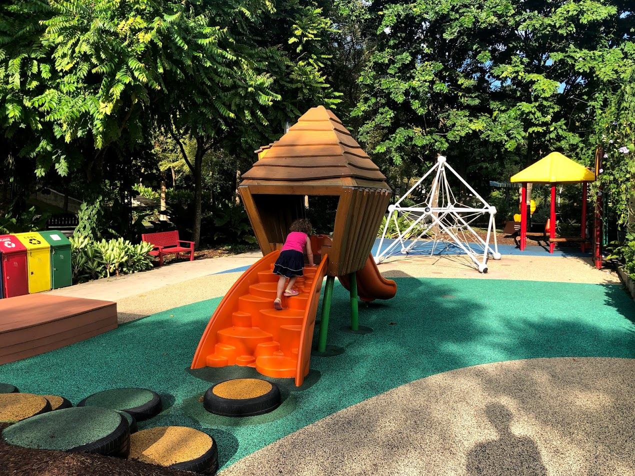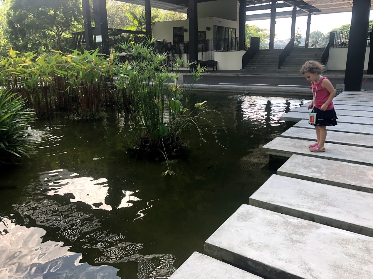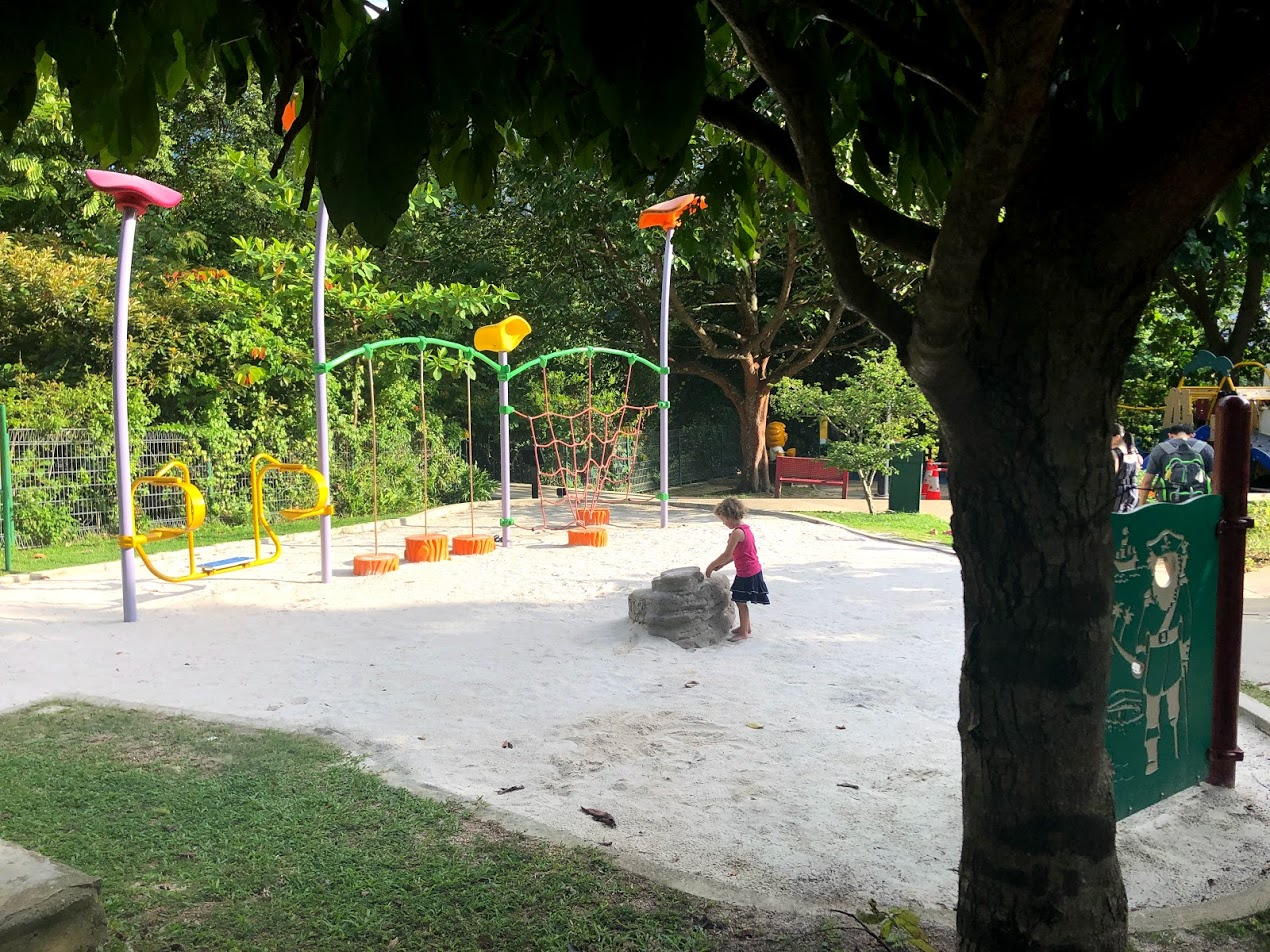 MsE would have been happy just wandering around the gardens, but we did discover the Nature PlayGarden so we spent some time there. The PlayGarden was spread out over 3 areas, so a lot of children could have played here. On a weekday just before dinner, we were the only ones there which suited us just fine. 2 of the zones were rubber bottomed. One zones was sand, which caused MsE to take off here shoes like usual. This causes a bit of a problem when we leave. The sand sticks to you feet because you are sweaty and doesn't brush off well because of the humidity.