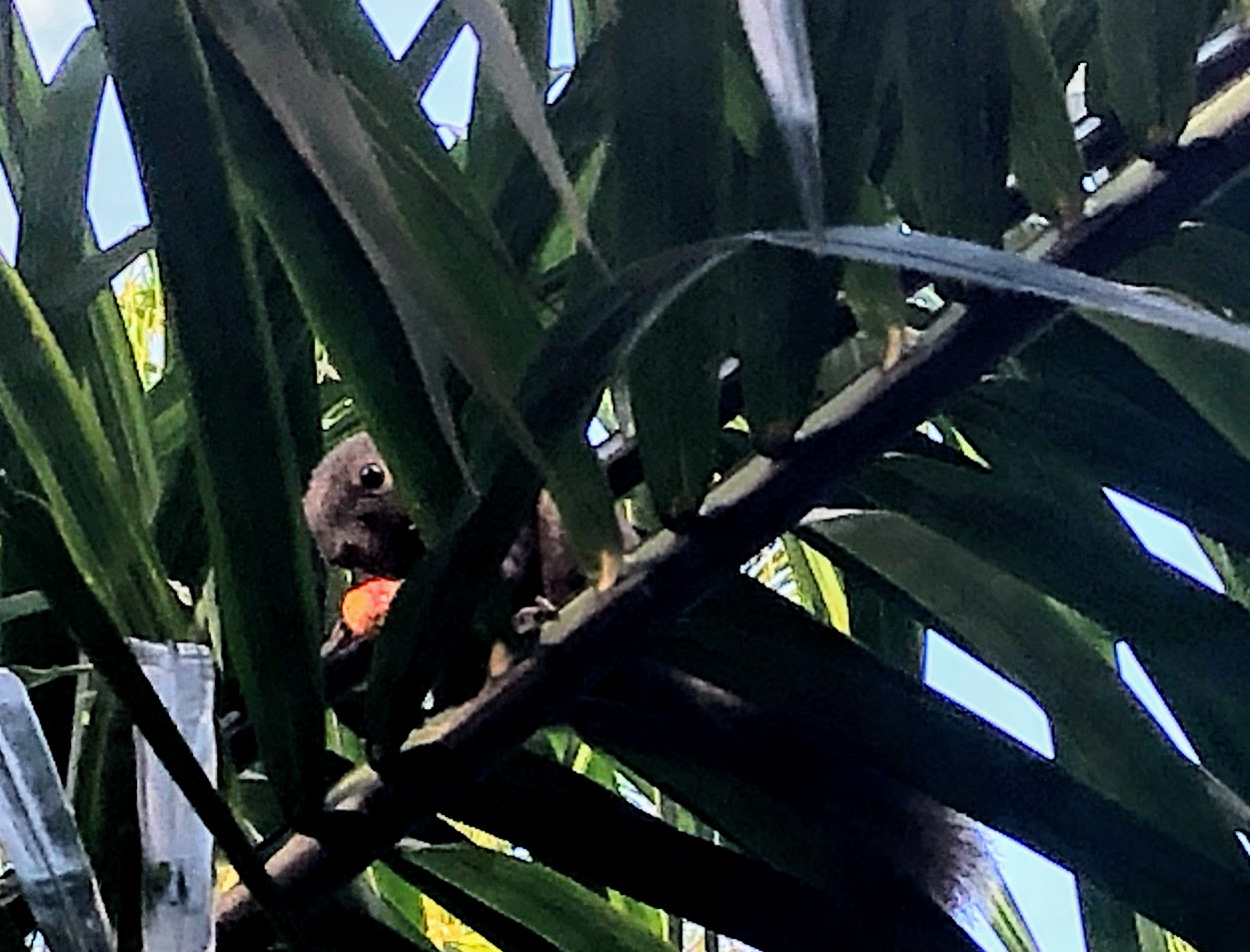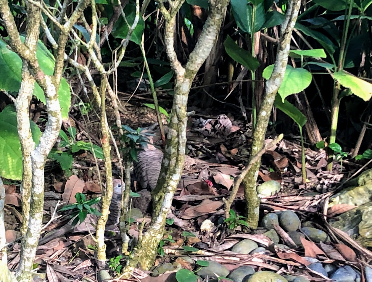 Once we got deeper into the park there were so many Plantain Squirrels. They're the ones with tails that look like feathers. We followed them along the palm branches. We watched the one below eating an orange coloured nut or seed. It took MsE a while to spot the zebra doves in the park. They're the smallest of the doves around here. While they stand out in the paths and manicured lawns at our home, they were well camouflaged in the park.