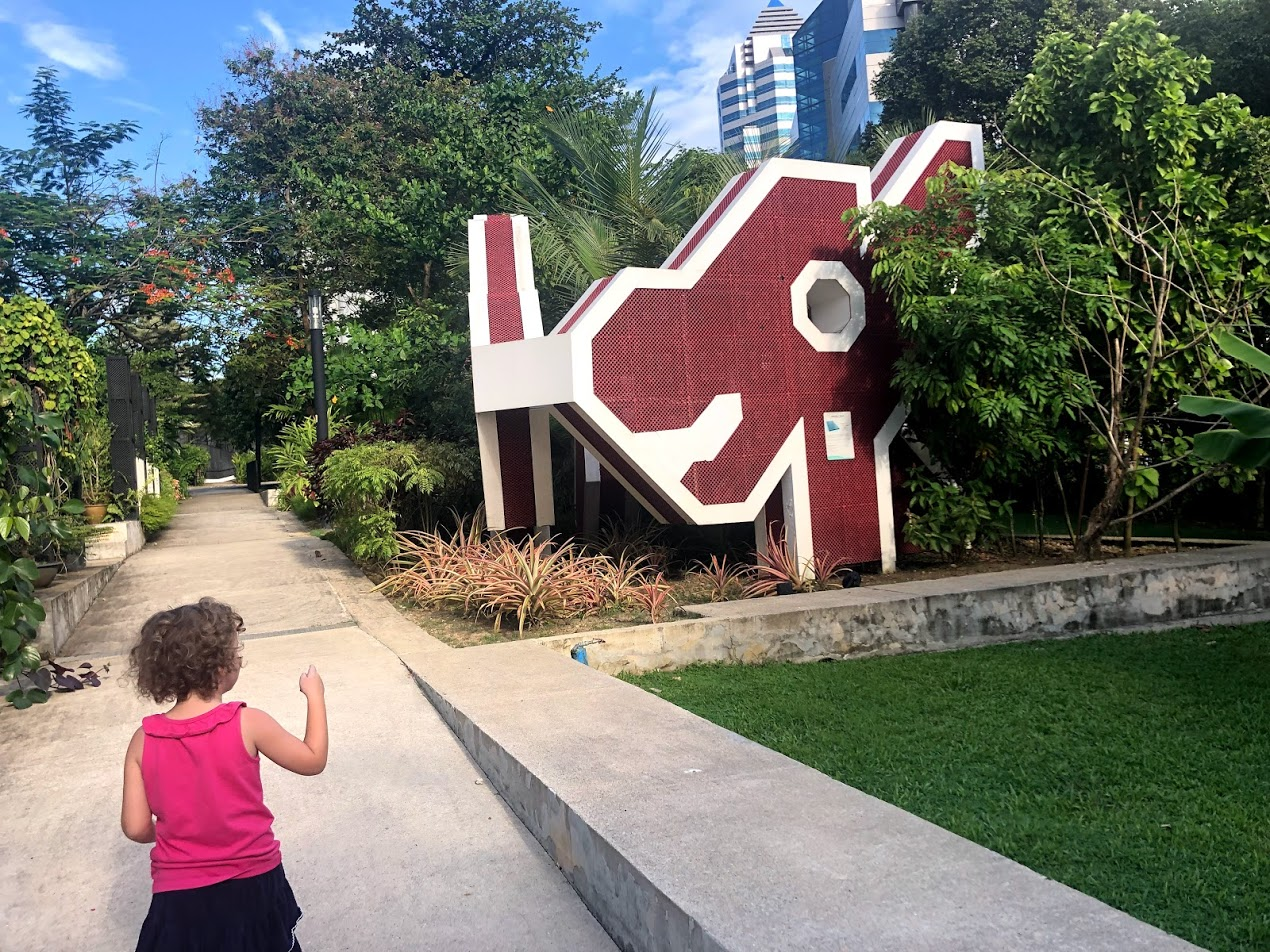MsE pointed out the red sculpture above and was certain that it was the play sculpture talked about in one of our Singapore Storybooks of a dragon who is now unable to move, but tells stories to the children as they play on it in the park.