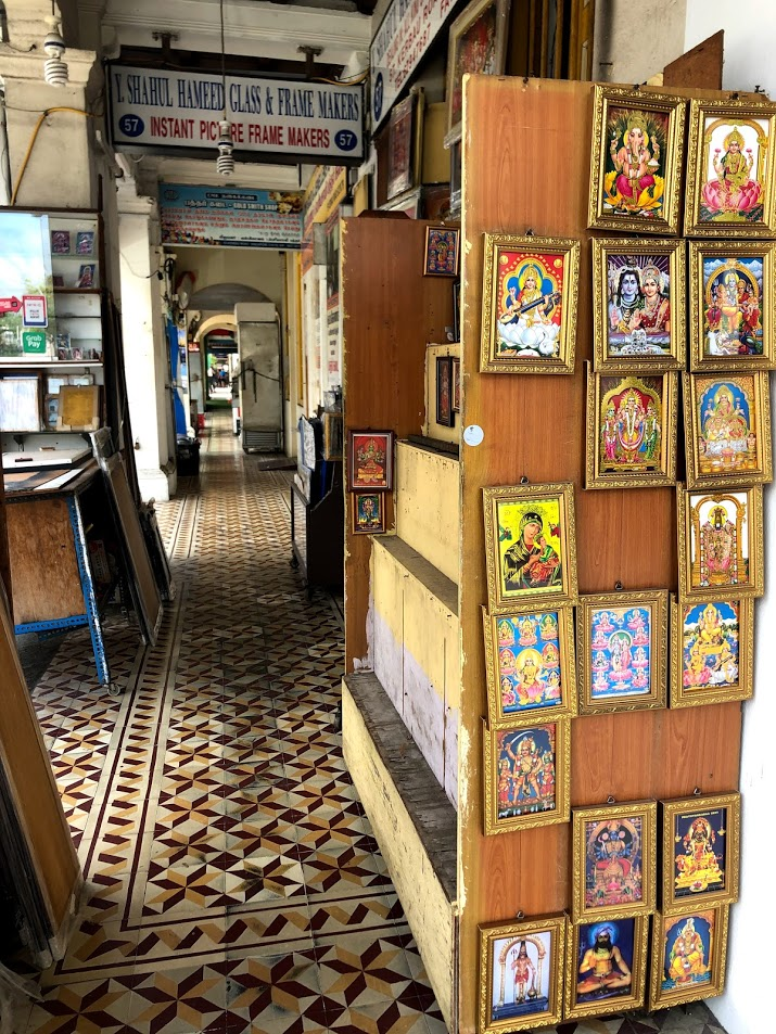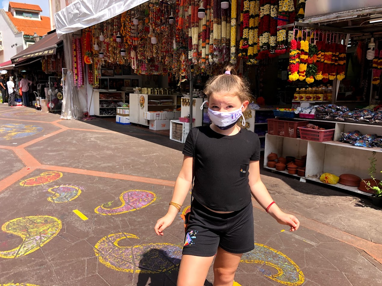 The streets of Little India are lined by covered walkways with intricately tiled floors. You can't decide if you are in the store or not as you pass along them. MsC likes to stick to them because they are in the shade. It was already very hot among this gardenless area at 10 am.