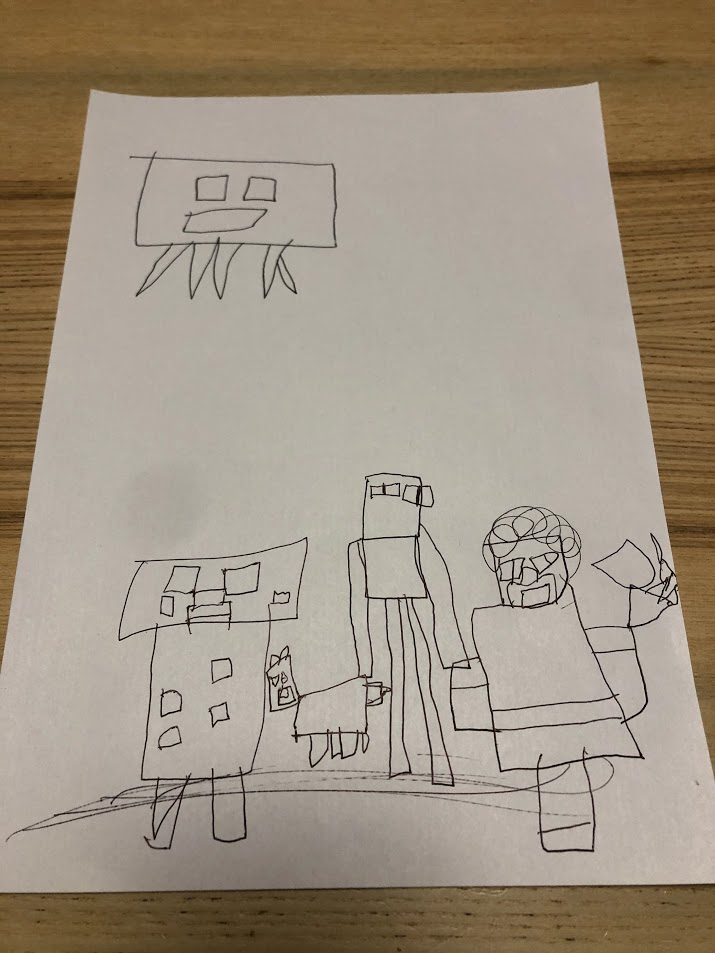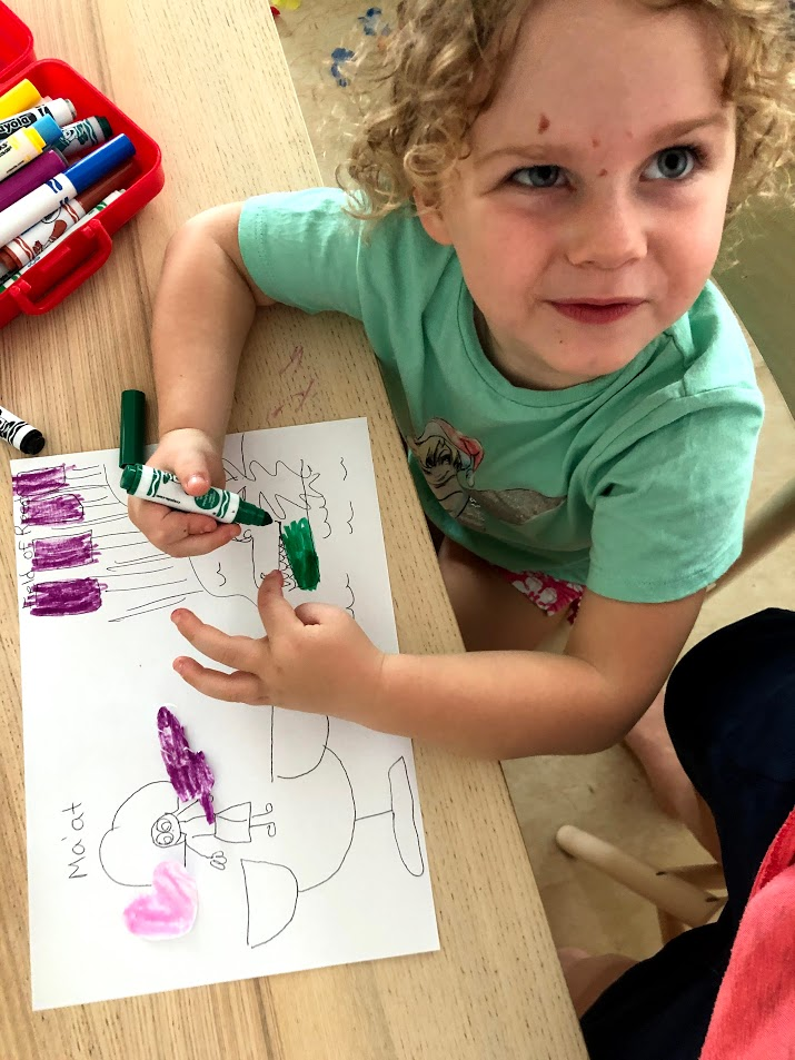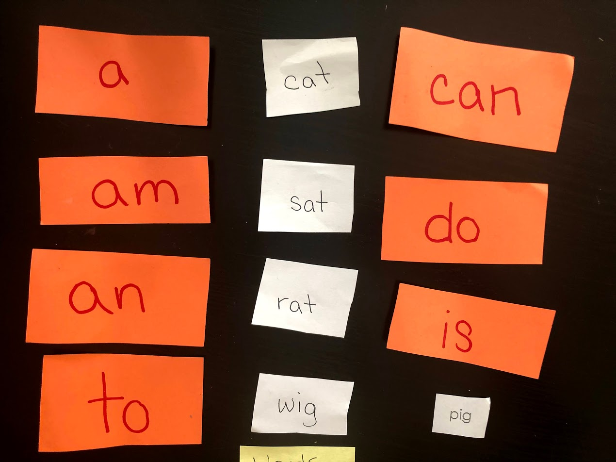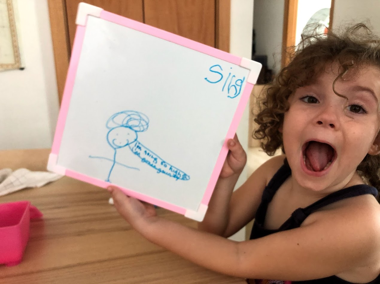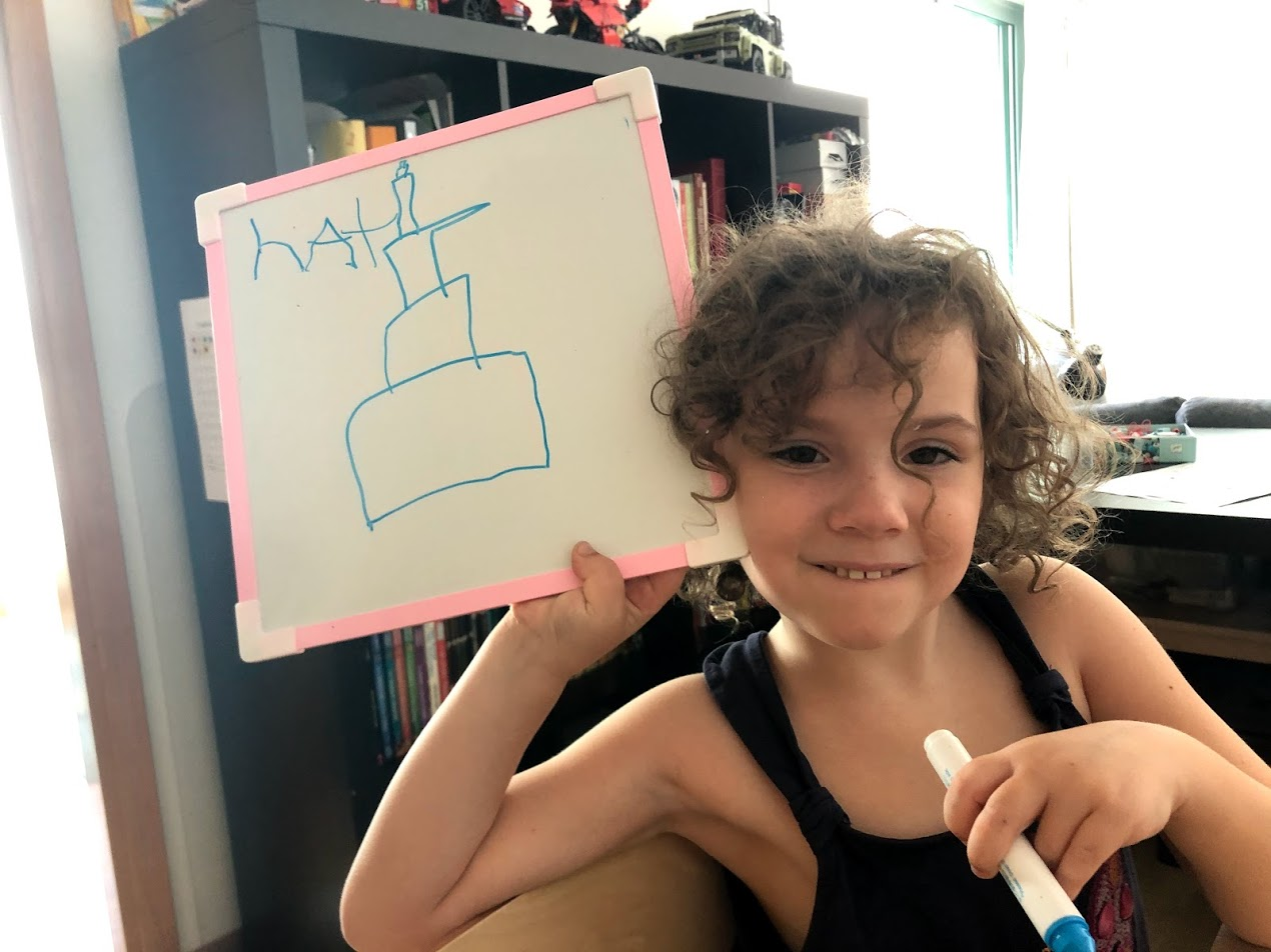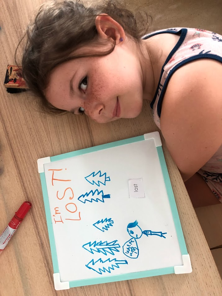 We started a new activity with white boards. The girls pick a word from the bag, read it, draw it, and then write the word. MsC takes 2 words to make it more challenging and usually combines them in a funny way and then uses both the words in sentences in the drawing.