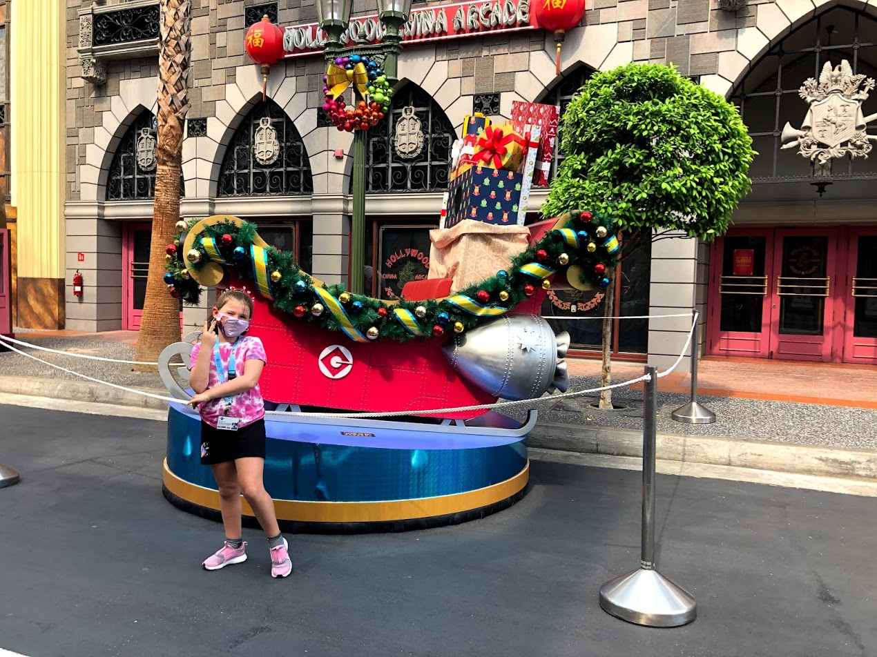 Most of the Christmas decorations are found as you enter the park on Hollywood Blvd, and then there are some good ones on the next "street". Once you get to the about 1/4 of the way into the park, there are no more decorations. It's like this for every holiday. It makes me miss Disney, who add seasonal decorations to even the farthest reaches of their parks. But as you can see we had fun getting festive photos.
