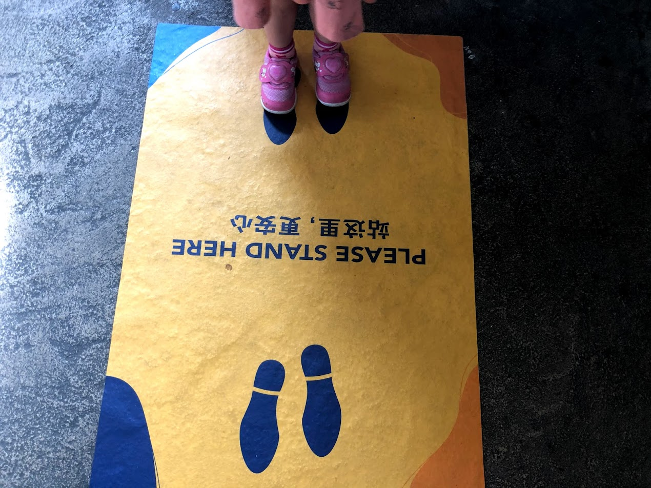 MsI found the footprints to stand on for social spacing in every line. These rectangle are supposed to indicate 2 people per box. We were told to split into 2 groups while standing in line.