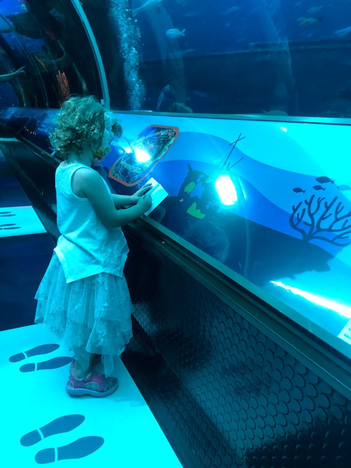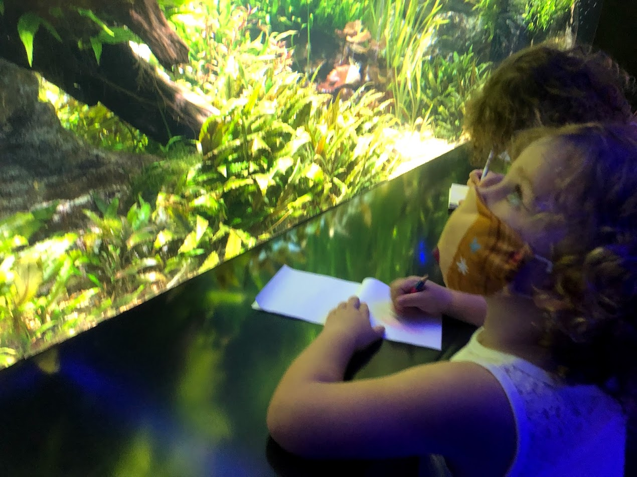 MsI isn't a member so she can't collect the worksheets. I brought her a pad of paper stapled together and she "sketched" along with the big girls. The Aquarium gave her a sticker when the big girls collected their worksheets from Customer Service. MsI put it on the front of her stack of papers.