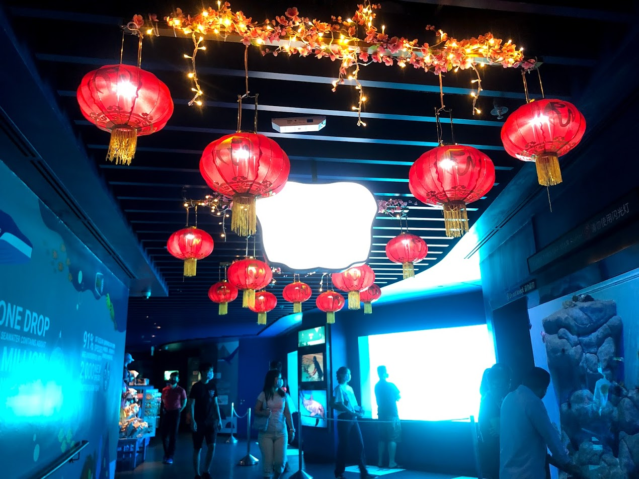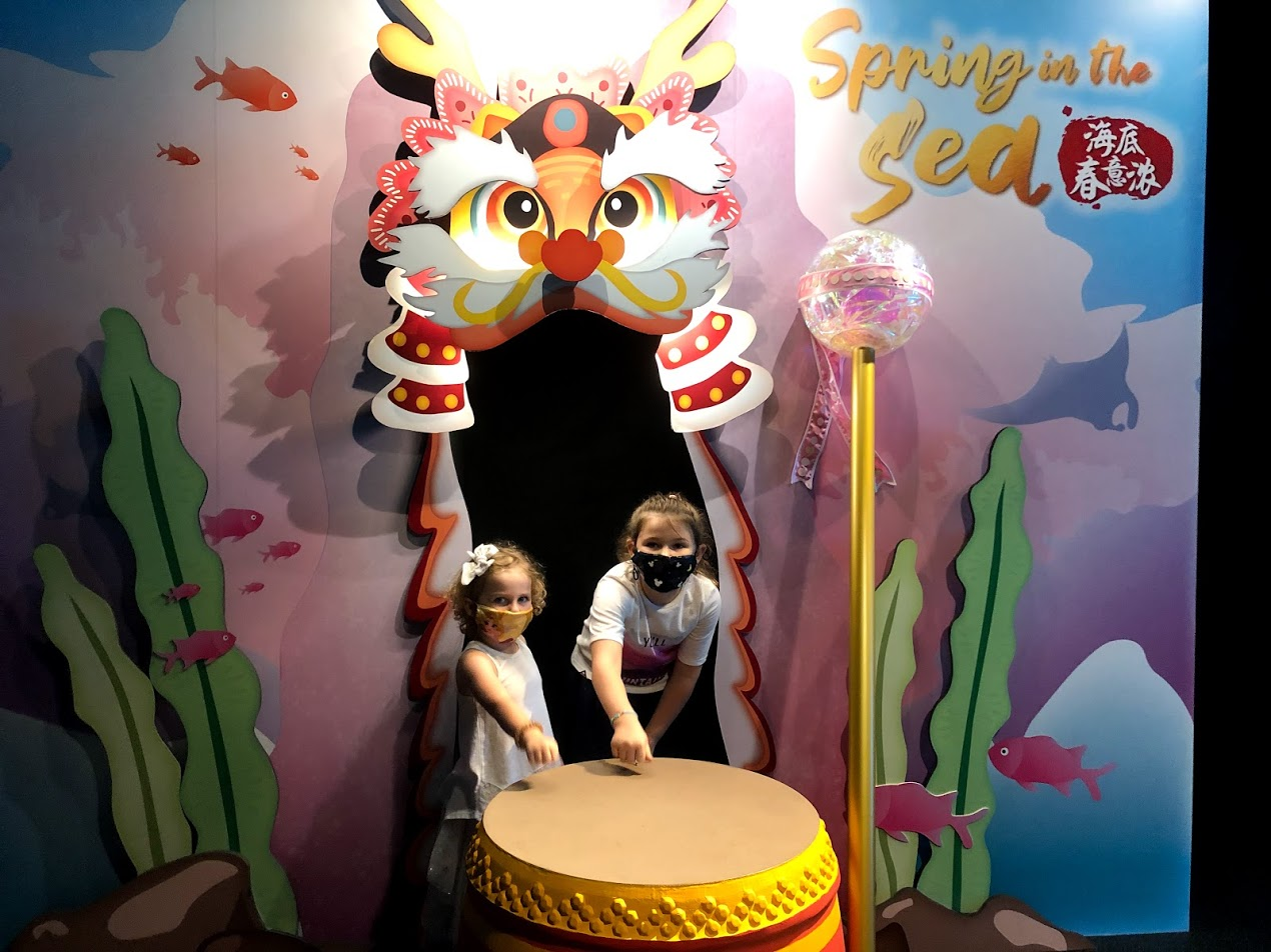 Chinese New Year is less than a month away now. The Aquarium was decorated up for it with glowing red lanterns, dragons and signs indicating auspicious marine animals. The girls banged the drum in front of the dragon, reminding us of dragon dances.