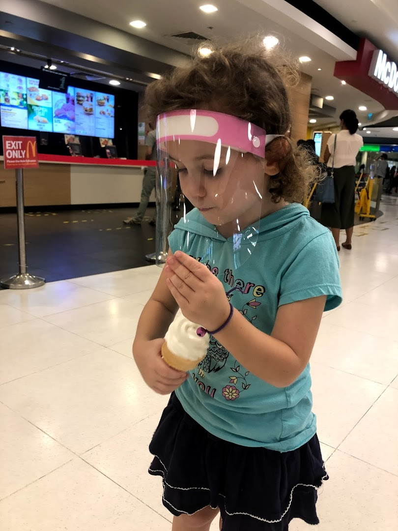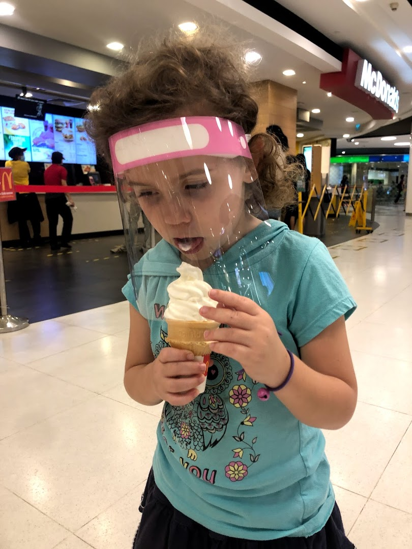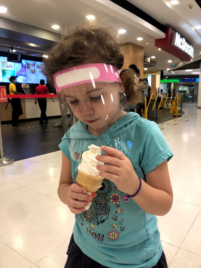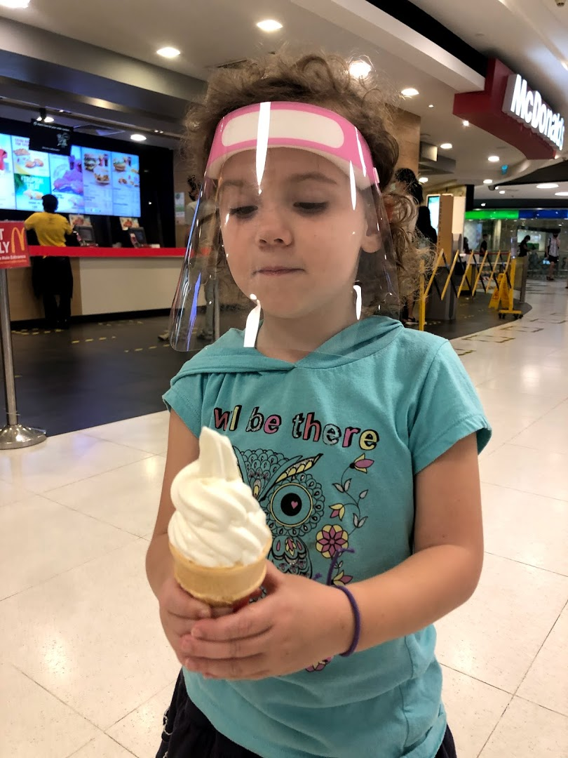 Watching MsE figure out how to eat an ice cream cone in a face shield was the best thing ever. As soon as I handed her the cone, she almost slammed it right into the face shield, before she remembered the shield, saying "Oh, yeah!" She then very very carefully slide the cone inside and took a lick. I made her wait till we were at a table and could take off her shield after that.