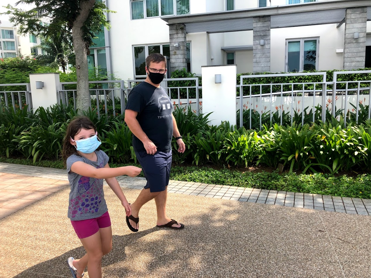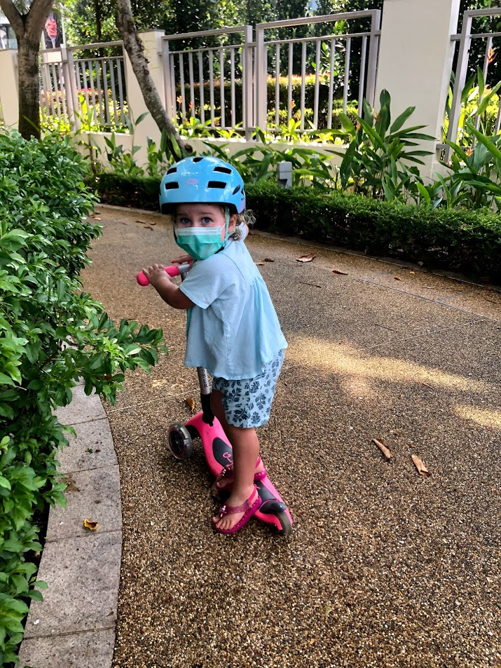 This morning we took the kids out for a short walk around our complex to practice wearing masks. Everyone did great. I think the scooters and helmets helped distract the little ones from the masks.