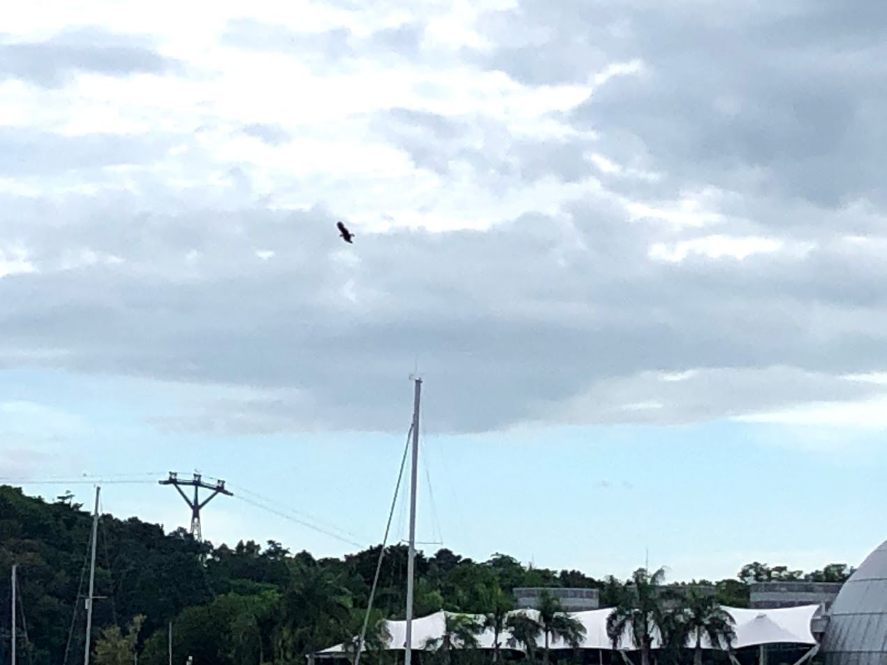 I wrote a post a while back about all the marine life we're seeing in the saltwater canals of our condo which are connected to the ocean: Sting rays, salt water turtles, plenty of fish. A number of neighbours have spotted monkeys in the palm trees at our condo who've come down from Mt. Faber. Normally the busy road and all the people would have kept them away. In the air, there are plenty of birds. The latest one I've added to my list of sights is the Brahminy Kite. It looks like a Bald Eagle, but with golden brown wings. I keep seeing it soaring quite low over the boats moored in the the marina.