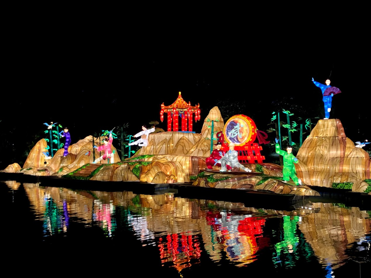 Night had fallen as we had eaten at the open air tables, so we headed off, completely stuffed, in the direction of the drums. Below are the highlights from our walk in the order of when we saw them. Pictures don't do this justice: The warm night air (around 30 C), the traditional chinese music in the background and surrounding us, the earthy smells of the gardens and water, the crowds, the changing lights. Many of the floats had elements of movement with what looked like rivers of moving lights.