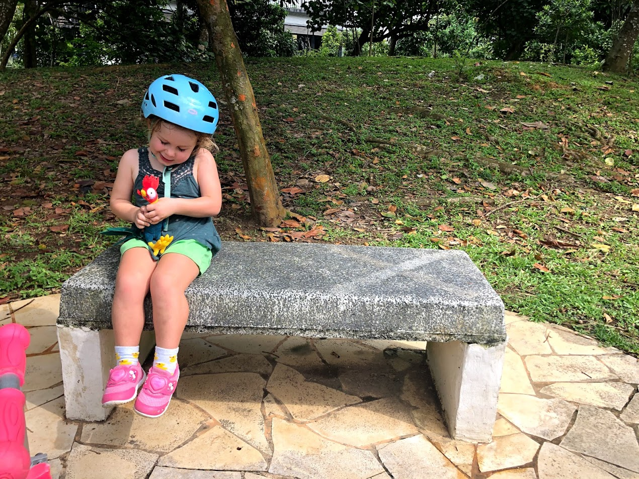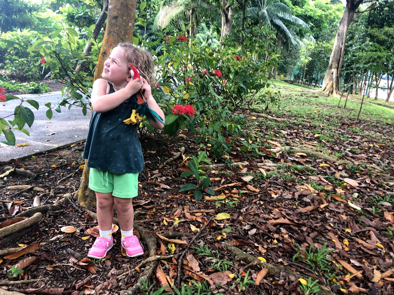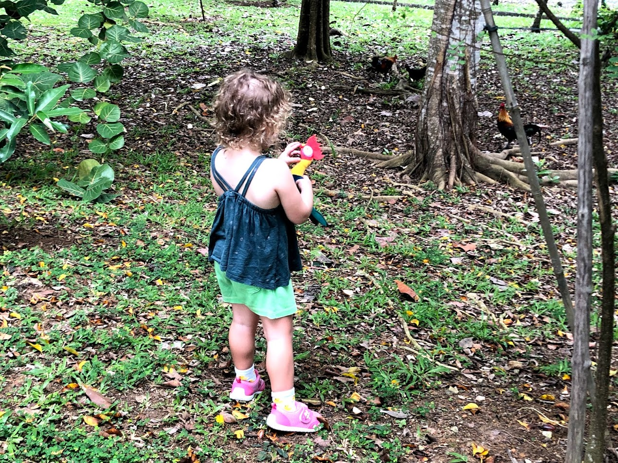 When MsI realized we were going to the Park, she ran and got Hei Hei (the chicken from Moana). She wanted to show him the the Jungle Fowl that live in the park.