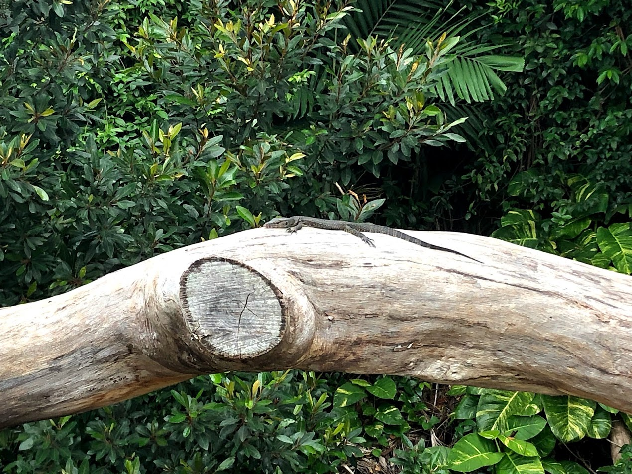 - A different type of lizard, about 18 inches long or 2 feet long, sunning itself on a log over the ocean; and then